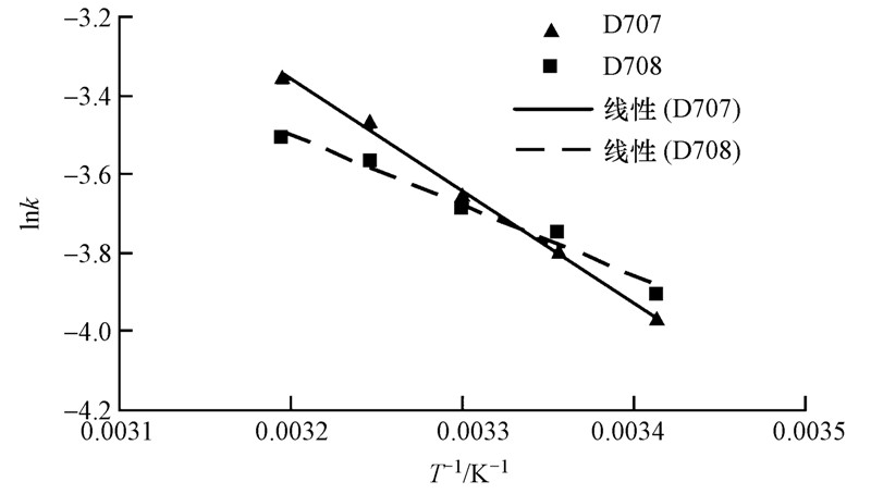 以lnk-1/T作图,结果如图 5所示.由Ea=-2.303R×n(n为拟合直线斜率),可求得D707、D708树脂吸附NH+4的表观吸附活化能分别为54.67、34.46 kJ · mol-1.