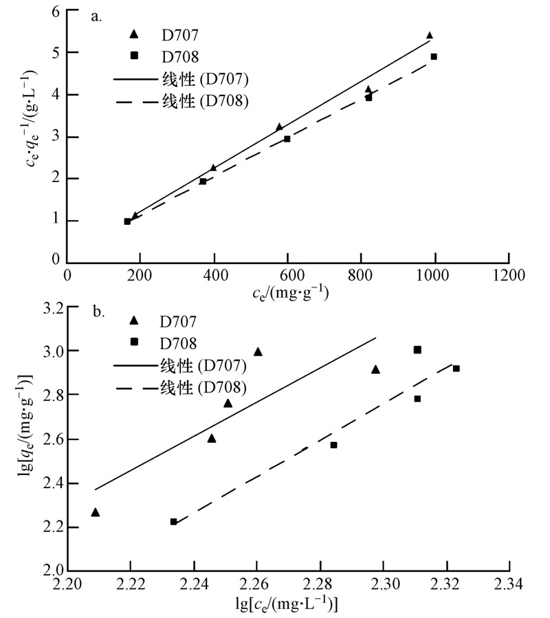 以lgqe对lgce作图(图 6b),可以发现,D707树脂的吸附效果用Freundlich吸附等温方程的拟合程度较差,R2仅为0.7331,而D708树脂的吸附效果用Freundlich吸附等温方程拟合的R2为0.9158.两种等温吸附模型拟合参数如表 4所示.