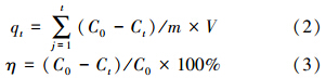 选取一定数量洁净的250 mL锥形瓶并加入100 mL氨氮废水,用精密天平准确称取定量预处理后的树脂后加入各锥形瓶内,将各锥形瓶放置于恒温水浴振荡箱中以恒定转速振荡,一定间隔取出样品并移取溶液至50 mL容量瓶内定容,用可见分光光度计测量剩余浓度Ct,直至吸附平衡,计算吸附量qt和吸附率η: