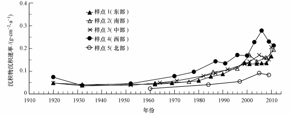 样点4(西部)在近百年间的沉积速率均比其他样点的相应值大,样点5(北部)在近50年间的沉积速率均比其他样点的相应值小.在各样点估算的平均沉积速率结果表明,样点2(南部)的平均沉积速率最大,为0.113 g · cm-2 · a-1,其沉积速率在近40年间增加得最明显;其次是样点4(西部),为0.089 g · cm-2 · a-1; 再次是样点1(东部)和样点3(中部)的平均沉积速率,分别为0.084和0.086 g · cm-2 · a-1;样点5(北部)的平均沉积速率最小,为0.050 g · cm-2 · a-1. 可见,湖心区沉积物中的沉积速率具有空间差异性,西部沉积物在近百年间的历史沉积速率较大,而南部在近40年间的沉积速率增幅较大.