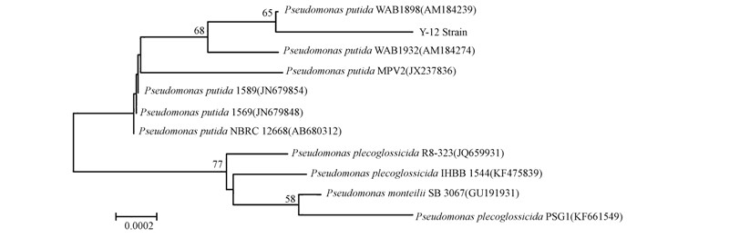 对菌株Y-12的16S rRNA进行PCR扩增,克隆后的测序结果显示,该菌的16S rRNA全长为1459 bp.Blast比对分析发现,菌株Y-12与恶臭假单胞菌(Pseudomonas putida)系统发生地位基本相同,相似度达到99%.从GenBank数据库中选取该菌株对应的模式菌株,采用MEGA6.0软件进行多序列比对分析,并用邻近法构建系统发育树(图 7).结合菌株Y-12的形态学观察、特异性磷脂脂肪酸鉴定及16S rRNA鉴定结果显示,菌株Y-12与恶臭假单胞菌亲缘关系最近.