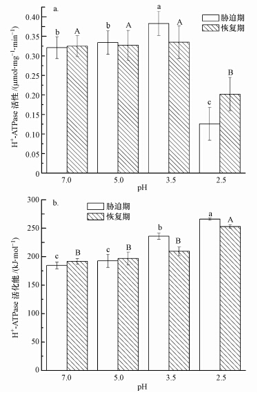 | 图 1 不同pH值模拟酸雨对水稻叶片细胞质膜H+ATPase活性(a)和活化能(b)的影响(不同字母表示各处理间差异显著(p<0.05),大小写字母分别表示胁迫期和恢复期差异显著效果,下同) Fig. 1 Effect of simulated acid rain at different pHs on activities of plasma membrane H+-ATPase(a) and activation energy of H+-ATPase(b)in rice leaves |