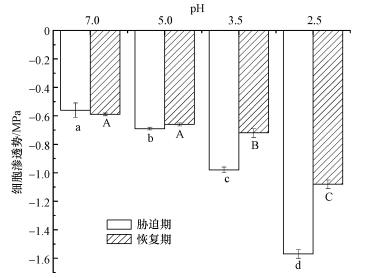 植物在逆境下降低渗透势,是植物抵抗逆境胁迫的一种重要方式.降低渗透势在植物体内可通过3个途径实现:①细胞内水分减少;②细胞体积缩小;③细胞内溶质增加.由图 2可知,胁迫期,pH=5.0、3.5和2.5处理组细胞渗透势均低于CK,且降幅随酸雨pH的降低而增大,pH=2.5组细胞渗透势降幅达179.8%.结合H+-ATPase活性和活化能变化(图 1)分析可知,pH=5.0酸雨并未造成H+-ATPase活性与活化能变化,但胞外H+浓度因酸雨强度增大而升高,部分H+进入细胞,渗透势降低.这表明与H+-ATPase相比,渗透势对pH的变化更敏感.pH=3.5酸雨组H+-ATPase活性虽应激升高,但调节胞内pH的能力下降,细胞渗透势降低可能是因为进入胞内的H+引起胞内离子含量发生改变(刘俐等,2008).pH=2.5酸雨组H+-ATPase活性与活化能均受抑,此时渗透势下降可能是因为pH=2.5酸雨引起质膜透性增加(吕霞等,2013),胞外的H+、SO2-4、NO-3等离子进入胞内.恢复期,pH=5.0组细胞渗透势恢复至CK水平,而pH=3.5与pH=2.5组细胞渗透势虽仍然低于CK但高于胁迫期,表明进入胞内的H+减少,细胞渗透势得到部分恢复且恢复程度受酸雨强度制约. pH=5.0组细胞渗透势恢复至CK水平,这与恢复期无外源H+进入细胞且质膜H+-ATPase调节功能未受抑制有关,也说明低强度胁迫下植物细胞渗透调节具有暂时性(彭立新等,2002).然而,pH=3.5组细胞渗透势低于CK水平,原因可能是H+-ATPase提供的质子驱动力引起部分离子进入细胞并积累.pH=2.5酸雨对H+-ATPase活性与活化能造成不可逆伤害,胞内pH的调节能力受抑,致使胞内仍积累H+,细胞渗透势无法恢复.