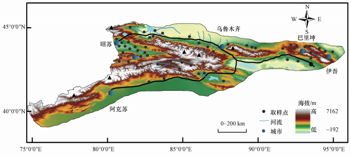 2 材料与方法(Materials and methods) 2.1 研究区概况天山山地横亘于中亚(40°~45°N,67°~95°E),主要分布在中国境内的新疆,东西长约2500 km,南北宽约250~300 km,平均海拔约2 km,总面积5.7×104 km2.天山将新疆分为两大部分:南部为塔里木盆地,北部为准噶尔盆地.由于地处西风带以及巨大的高度和独特的山地走向,天山山体拦截了来自大西洋和北冰洋的大量水汽,带来大量降水,使之成为干旱区中的水塔,众多内陆河流发源于此,因此被称为“旱海荒漠中的湿岛”.天山山地气候大陆性特色鲜明,以冬夏气温趋于极端为特征,降水的季节变化较大.其中山区降水丰富,北坡年降水量可达500~700 mm,西段个别处可达1000 mm.天山极高山带发育大量的冰川.丰沛的降水与冰川融水使之成为众多河流、湖泊的发源地,新疆约65%的河流发源于此,年总径流量约为474×108 m3,占新疆年径流总量的54%.我国最长的内陆河-塔里木河和水量最大的内陆河-伊犁河均发源于此.河流汇集雪冰融水与雨水,灌溉山间盆地和谷地、山前平原农田和牧场(胡汝骥,2004).