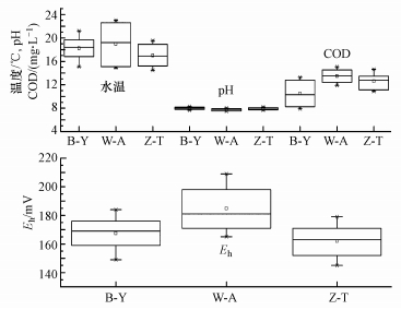 | 图 2 各区段水质监测箱式图 (Z-T: 天山西部昭苏-特克斯区段; W-A: 天山中部乌鲁木齐-阿克苏区段; B-Y: 天山东部巴里坤-伊吾区段) Fig.2 Box plots of monitoring data of water quality in each section of the Tianshan Mountains |