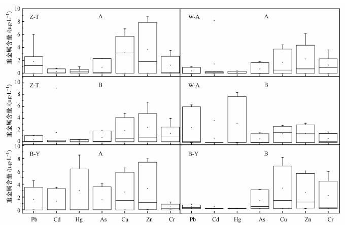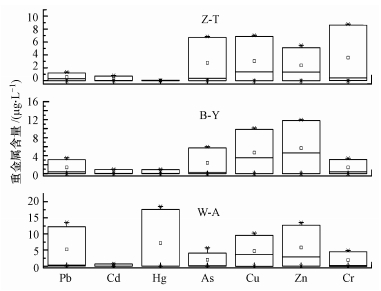 | 图 3 天山山地河流重金属的箱式图 (Z-T: 天山西部昭苏-特克斯区段; W-A: 天山中部乌鲁木齐-阿克苏区段; B-Y: 天山东部巴里坤-伊吾区段) Fig.3 Box plots of heavy metals contents in rivers of the Tianshan Mountains |