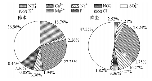| 图 1 降水和降尘阴阳离子所占比例 Fig. 1 Percentage of ions in precipitation and dustfall |