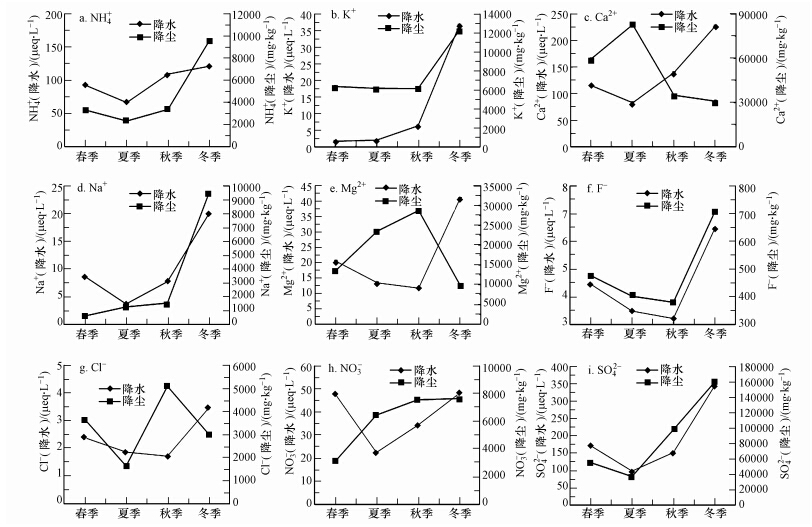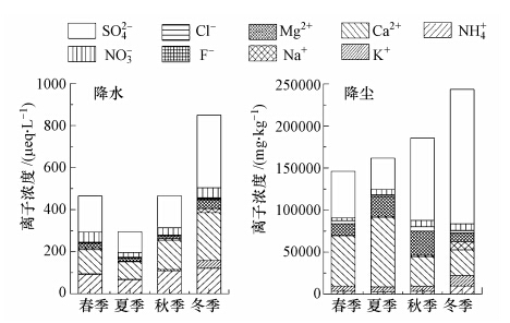 | 图 2 降水和降尘中阴阳离子浓度季节变化 Fig. 2 Seasonal variations of concentrations of ions in precipitation and dustfall |
