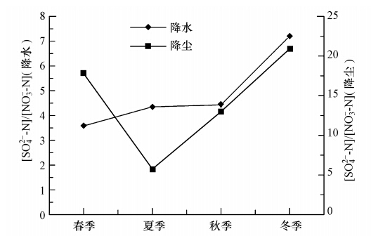 | 图 4 降水和降尘中[SO42-]/[NO3-]值随季节的变化 Fig. 4 Seasonal variations of [SO42-]/[NO3-] in precipitation and dustfall |