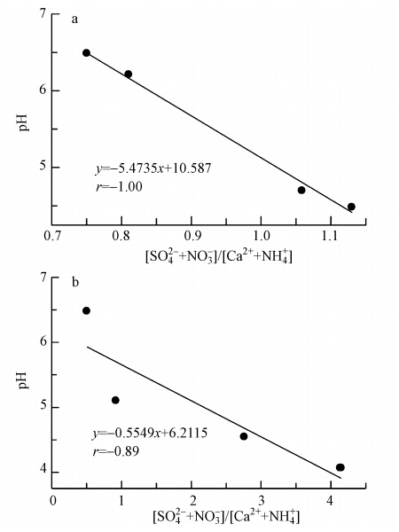 | 图 5 降水(a)和降尘(b)中pH与 [SO42-+NO3-]/[Ca2+ +NH4+]的相关性 Fig. 5 Correlations of pH and [SO42-+NO3-]/[Ca2+ +NH4+] in precipitation(a) and dustfall(b) |