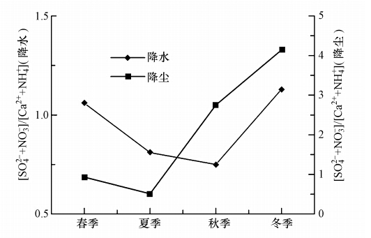 4)降水和降尘中[SO42-+NO3-]/[Ca2++NH4+]与pH值呈明显的负相关关系,相关系数分别是-1.00、-0.89.降水和降尘中[SO42-+NO3-]/ [Ca2++NH4+]相关系数是0.35.降水中[SO42-+NO3-]/ [Ca2++NH4+]最低值在秋季,而降尘是在夏季.