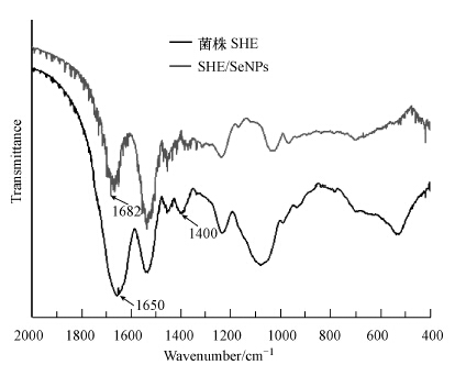 | 图 9 菌株SHE及菌株SHE与还原产物SeNPs混合物的红外光谱图 Fig. 9 FTIR of bacterial cells with and without SeNPs |