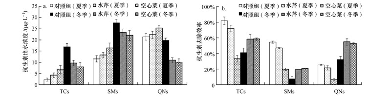 不同季节情况下3组水生植物滤床的抗生素出水浓度和去除效率的平均值如图 1所示.研究结果表明,水生植物滤床可去除废水中残留抗生素成分,但不同类别抗生素在不同配置的系统中去除效果具有差异性,并且受季节变化影响明显.