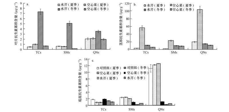 2 材料与方法(Materials and methods) 2.1 实验设计与样品采样本实验采用3组水生植物滤床系统,分别为空白对照组、空心菜种植系统和水芹种植系统,滤床系统有效容积为5 L.研究在试验前期采用Hoagl and 营养液将空心菜和水芹在沙盘上进行育种至10 cm,之后选取性状表征相似的水生蔬菜分别移栽到2个系统中,每个滤床中栽种植物20株.实验进程分为两个阶段,即夏季(8—9月)和冬季(12月—1月),每个阶段独立进行,分别栽种水生植物,每阶段运行时间为60 d.为模拟实际养殖废水的抗生素水平,实验设计在实际养殖废水投加3大类抗生素成分(四环素类抗生素3种、磺胺类抗生素3种及喹诺酮类抗生素3种,共9种)以作实验水体,在保证植物体的正常生长前提下,3大类抗生素含量保持相似水平,各类总量分别为30 μg · L-1(Wei et al., 2011;Zhang et al., 2011;Chen et al., 2012;廖德润等,2013a).其中,实际养殖废水取自厦门市集美区某养猪场的厌氧好氧串联生物处理装置后集水池,并置于冰箱(4 ℃)中保存备用.