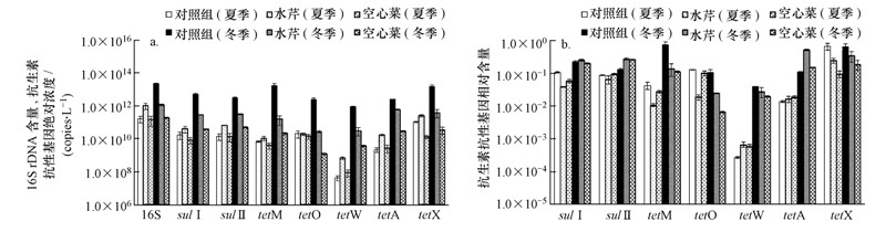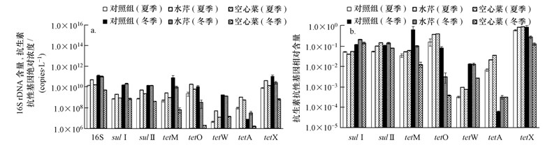 在夏季和冬季试验末期,为了考察分析深度处理养殖废水过程中微生物在水生植物滤床中的变化趋势,3组系统的出水及底泥中抗生素抗性基因含量和16S rDNA水平被测定,并且为减少分析测定过程中所产生的误差,本研究后续论述将基于抗生素抗性基因的相对含量(目标基因拷贝数/16S rDNA拷贝数)进行分析探讨(Wu et al., 2010; Liu et al., 2013a; McKinney et al., 2010).