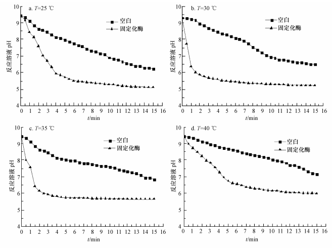 用图 1所示实验装置研究温 度对固定化酶催化吸收CO2的影响,实验结果如图 7所示.加入固定化酶后,显著加快了水吸收CO2的速度,溶液pH显著下降,固定化酶在T=30 ℃时催化吸收CO2的效果最好.在T=30 ℃时,前90 s内溶液的pH下降了3.27,水吸收CO2的量为4.2×10-6 L.没有酶的空白试验,水吸收CO2的量1.0×10-9 L.固定化酶催化吸收CO2的量是空白试验的4.2×103倍.整个催化反应时间是15 min,溶液pH从9.30下降到5.22,下降了4.08,相当于10%的反应时间完成了80.15%的催化吸收反应.