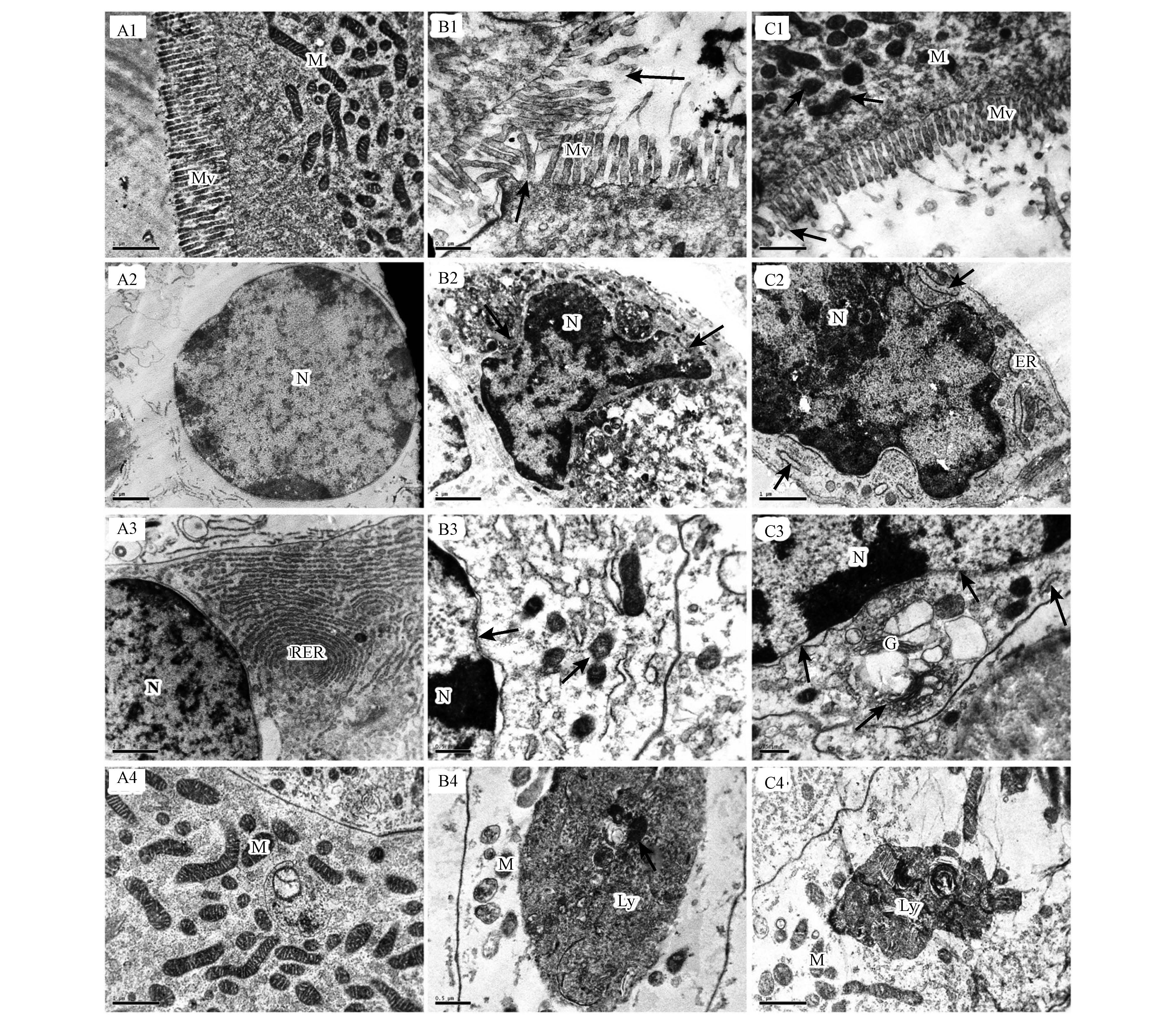 | 图 4 镉暴露对河南华溪蟹肝胰腺组织超微结构的影响 (A1~A4,对照组:A1. 20000×,微绒毛;A2. 8000×,细胞核;A3. 10000×,各细胞器形态;A4. 20000×,线粒体;B1~B4,急性处理组:B1. 30000×,微绒毛排列紊乱,部分脱落、融解、消失(↑);B2. 10000×,染色质边集,核膜融解(↑);B3. 30000×,核变形,线粒体损伤,基质局部电子密度降低,嵴结构不清(↑);B4. 30000×,自噬体,似吞有线粒体结构的物质(↑);C1~C4,亚慢性处理组:C1. 20000×,少数微绒毛脱落,线粒体结构模糊(↑);C2. 20000×,细胞核变形,核染色质浓缩,内质网肿胀;C3. 25000×,核膜模糊,内质网扩张,核糖体脱落(↑),高尔基体异常(↑);C4. 20000×,自噬体;Mv:微绒毛;M:线粒体;N:细胞核;Nu:核仁;RER:粗面内质网;ER:内质网;Ly:溶酶体;G:高尔基体) Fig.4 Effects of Cd on ultrastructure of hepatopancreas in S. henanense(A1~A4, control group: A1. 20000×, the microvilli; A2. 8000×, the nucleus; A3. 10000×, the rough endoplasmic reticulum and cytomembrane are normal; A4. 20000×, the normal mitochondria.B1~B4, treated with acute group: B1. 30000×, the partial microvilli are deformed and disruption (↑); B2. 10000×, shows chromatin condensation and nuclear membrane disruption (↑); B3. 30000×, shows the nuclear membrane deformation, and the membrane structure of mitochondria is faint (↑); B4. 30000×, shows abundant of autophagosome, and it seems that one mitochondrion is phagocytized (↑).C1~C4, treated with subchronicgroup: C1. 20000×, the changes of the apical microvilli are not obvious, and the membrane structure of mitochondria is faint (↑); C2. 20000×, chromatin is condensed and the cytomembrane is distorted, the rough endoplasmic reticulum cisternae are dilated (↑); C3. 25000×, shows nuclear membrane ruptures (↑), rough endoplasmic reticulum cisternaes are dilated (↑), and the Golgi complex is abnormal; C4. 20000×, shows the area of autophagosome. Mv: microvilli; M: mitochondria; N: nucleus; Nu: nucleolus; RER: rough endoplasmic reticulum; ER: endoplasmic reticulum; Ly: lysosome) |