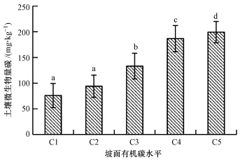5 结论(Conclusions)1)随着土壤有机碳水平的提高,0~20 cm土层土壤微生物量碳含量相应增加.0~10 cm土层土壤微生物量碳含量比10~20 cm土层更易受坡面有机碳水平的影响且对侵蚀压力的响应较敏感.