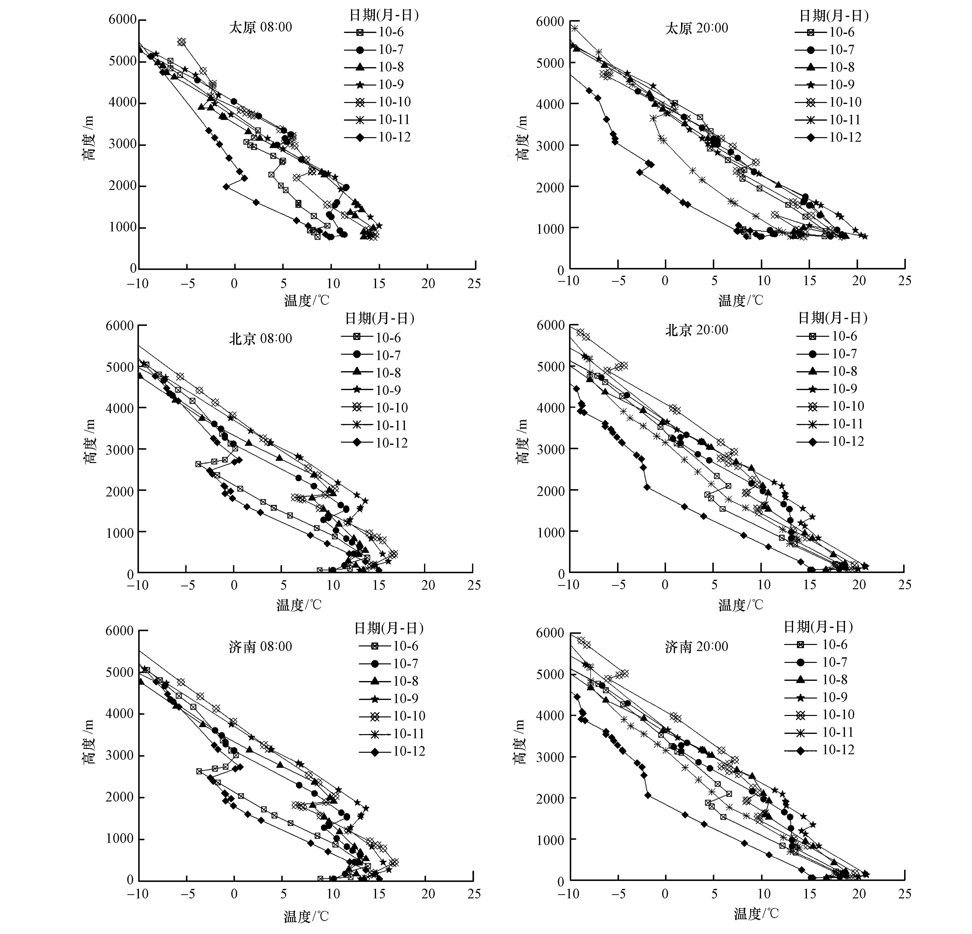 | 图5 太原、北京和济南的8:00、20:00温度廓线 Fig.5 Temperature profile at 8:00 and 20:00 in Taiyuan,Beijing and Jinan |