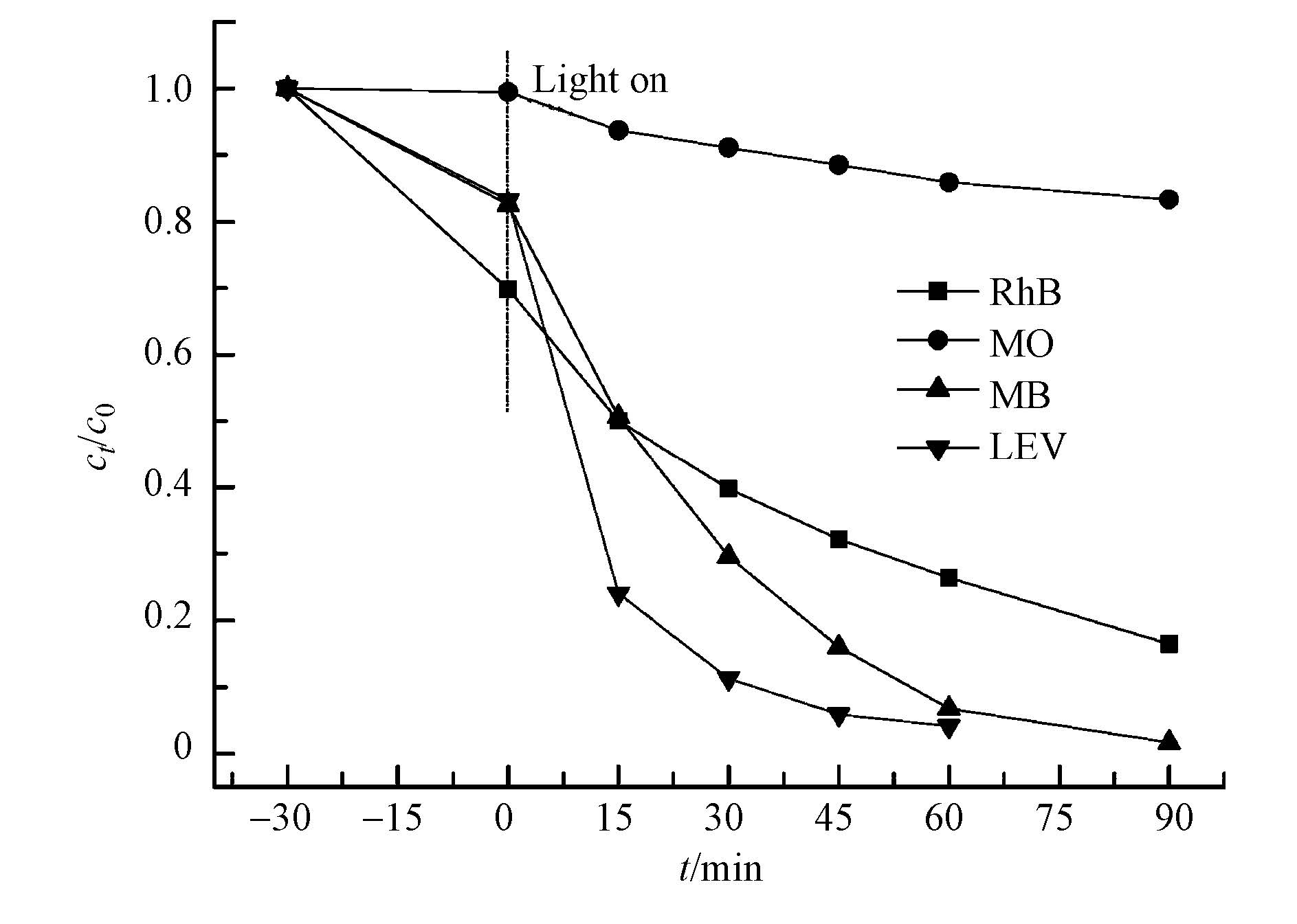 | 图5 In2TiO5纳米带对RhB、MO、MB和LEV的光催化降解曲线 Fig.5 ct/c0-t curves of photocatalytic degradation of RhB, MO, MB and LEV under UV irradiation on In2TiO5 nanobelts |