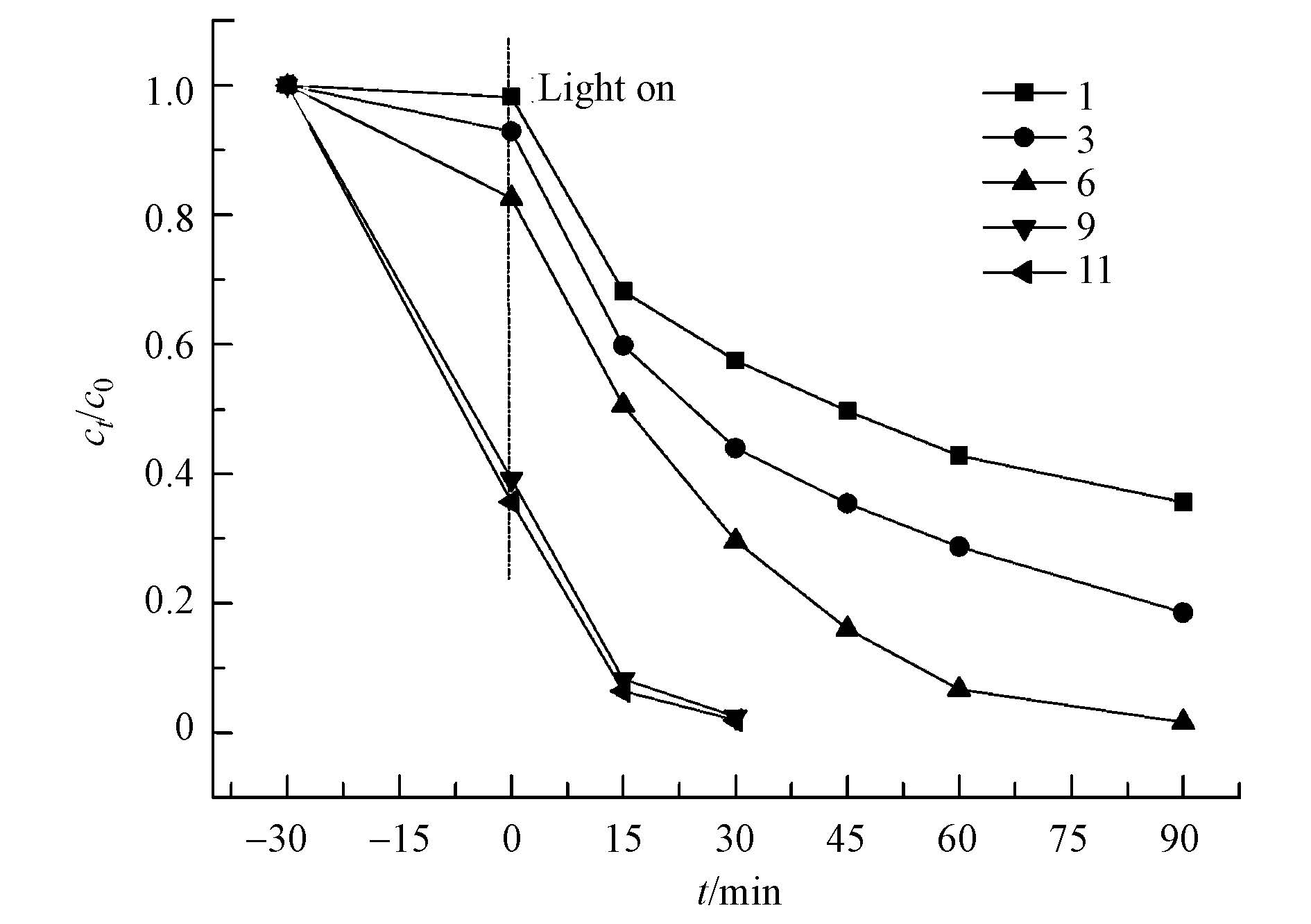 | 图6 溶液的pH对MB光催化降解效率的影响 Fig.6 Effect of pH values on the photodegradation rate of MB on In2TiO5 nanobelts |