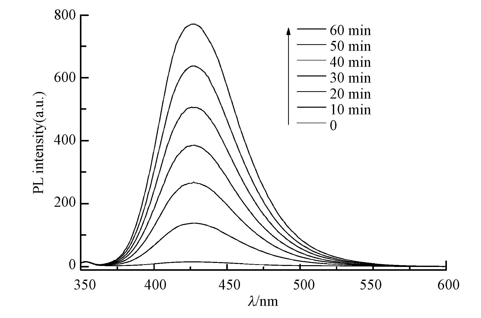 为了检测光催化反应过程中的羟基自由基· OH含量,采用对苯二甲酸-荧光技术,对半导体光催化MB体系中的· OH进行了探测.因为光催化剂在接受能量大于其吸收阈值的光照后,价带的电子就会跃迁到导带,产生光生载流子(电子-空穴对),空穴与H2O、OH-反应,最终生成· OH,· OH与TA反应生成2-羟基对苯二甲酸(TAOH),其在315 nm激发下会发出荧光,峰位为425 nm.图 9为反应体系中· OH的产生随时间的变化曲线.由图可以看出,随着光照时间的增加,荧光强度呈增加趋势,且与光照时间呈良好的线性关系.这说明光催化剂具备较强的光催化活性,与MB随光照时间的降解曲线中的分析相一致.