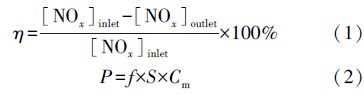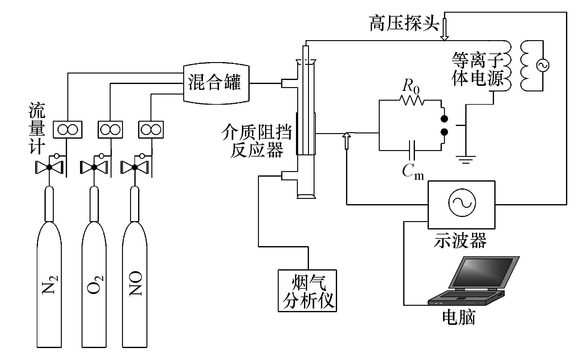 反应器为自制的同轴筒状介质阻挡放电反应器:采用外径为10 mm的石英管固定床反应器,高压电极为3 mm铜棒,在石英管外包裹铝箔作为低压电极.在反应过程中,固定放电频率8.9 kHz,改变放电电压,测试不同电压下NOx的分解效率.