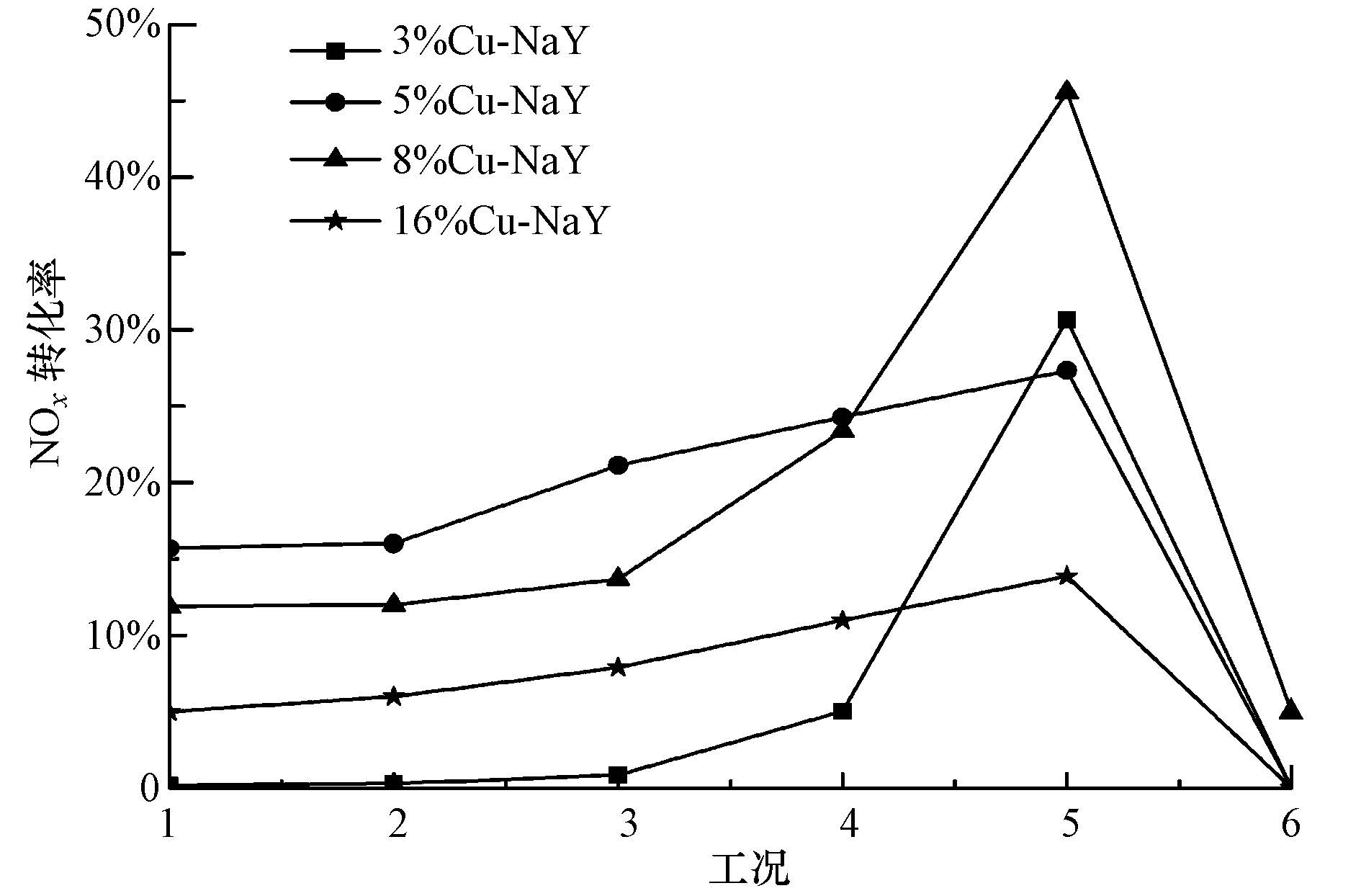 由于NaY分子筛在有氧条件下对NOx有一定的吸附量,为了消除吸附对NOx分解效率的影响,本文中所有实验使用的催化剂都提前进行NOx吸附,达吸附饱和后再进行实验操作.