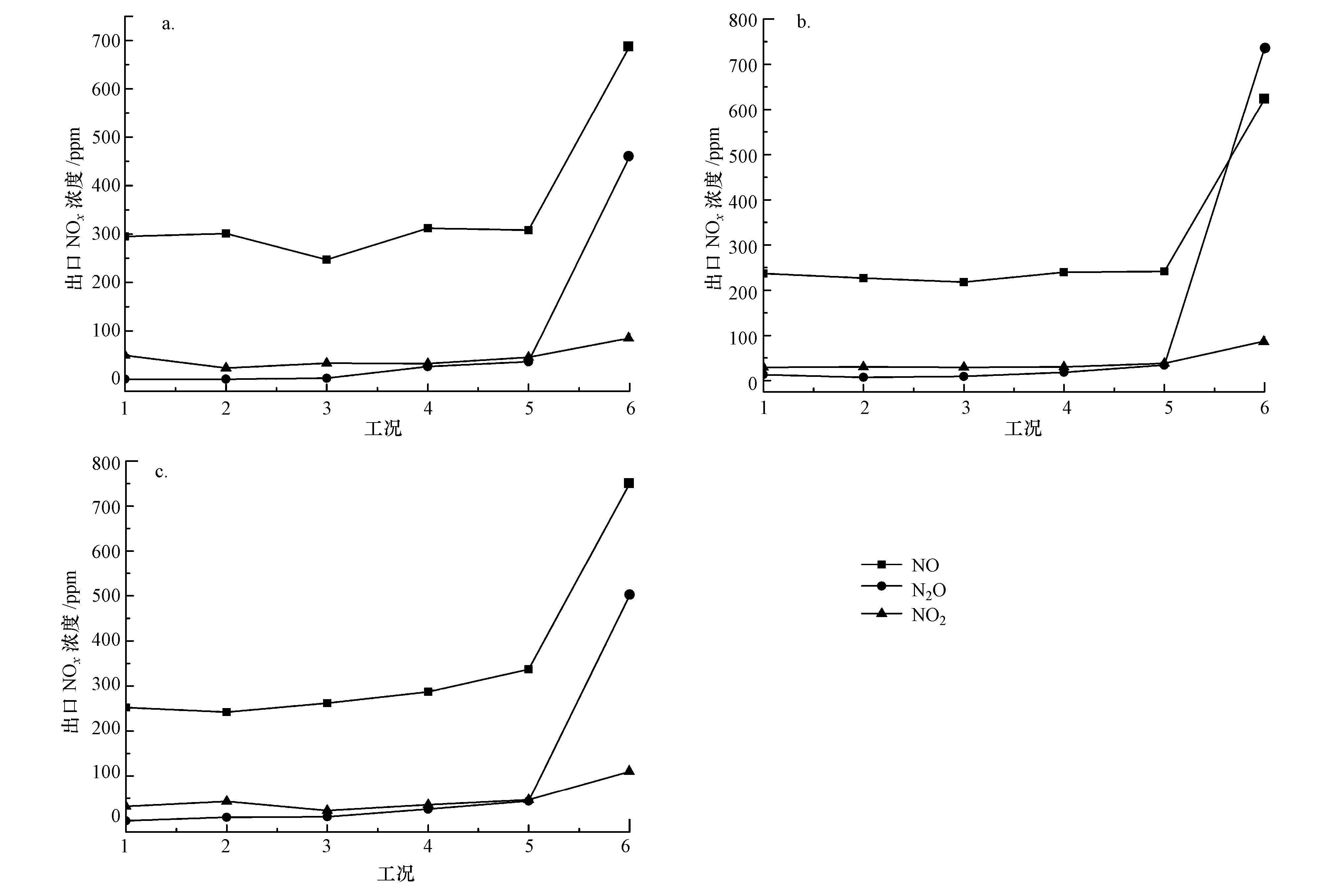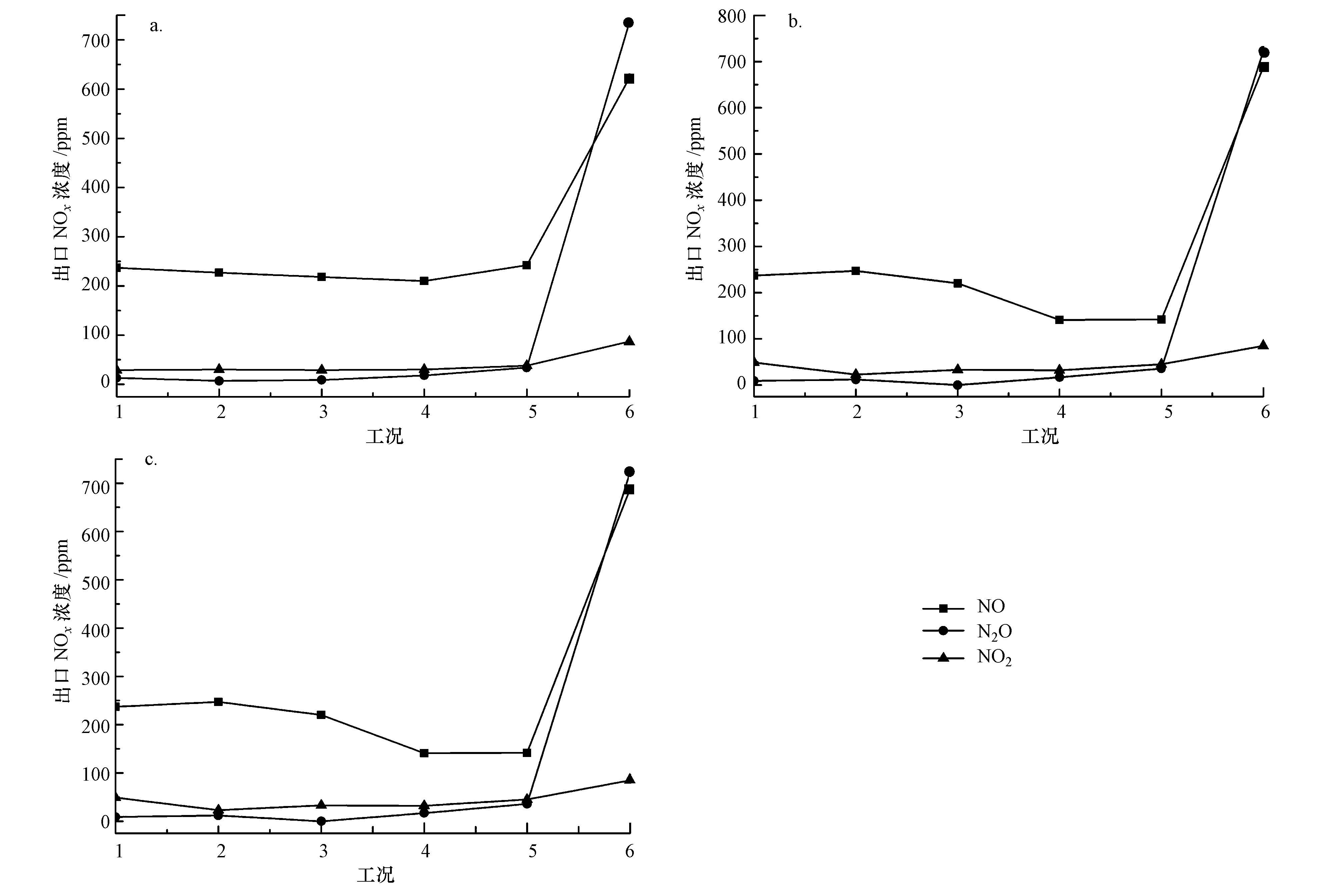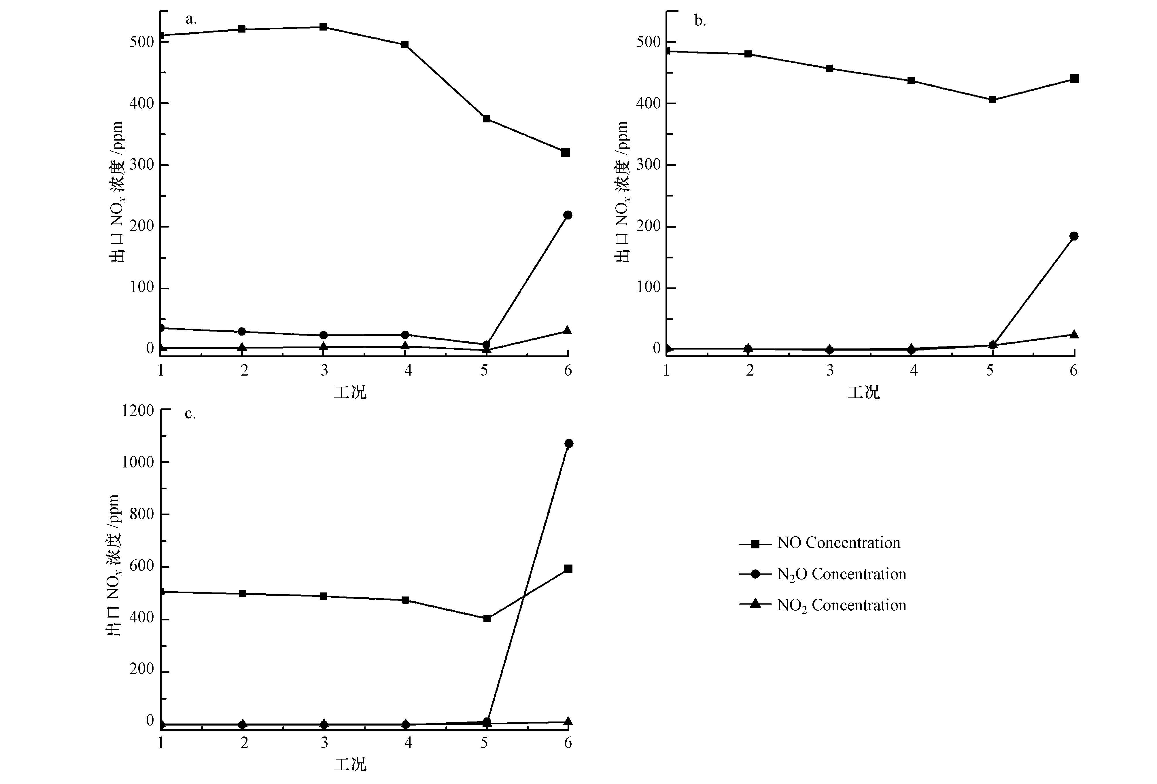 | 图7 不同La/Cu负载量下NOx催化分解产物分析(a.3%La-8%Cu-NaY;b.5%La-8%Cu-NaY;c.20%La-8%Cu-NaY) Fig.7 Analysis of NOx catalytic decomposition products of different La/Cu contents(a.3%La-8%Cu-NaY;b.5%La-8%Cu-NaY; c.20%La-8%Cu-NaY) |