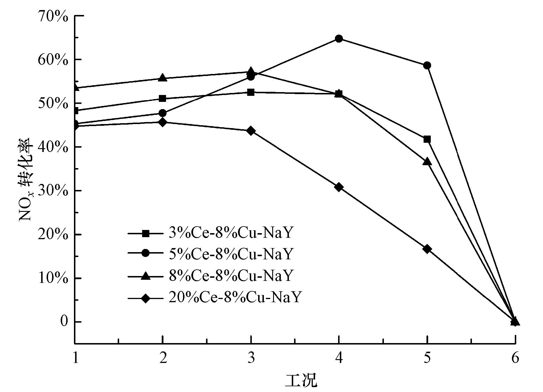实验采用不同含量的Ce(NO3)3溶液与8%Cu-NaY催化剂进行二次离子交换,制得Ce含量不同的催化剂,实验结果如图 4所示.Ce的引入明显提高了催化剂在有氧条件下的催化活性,当电压小于10 kV时,各催化剂NOx转化率在30%~70%之间,比Cu-NaY催化剂催化活性有很大提升.3% Ce-8%Cu-NaY催化剂在电压为6.8 kV时,NOx转化率达最大值56.1%.5% Ce-8%Cu-NaY有较高的催化效率,随着放电电压的增大,NOx转化率先增大后在减小,当放电电压为7.8 kV,功率为3.6 W时,NOx转化率达67.3%.根据图 3中的产物分析可知,当放电电压大于10 kV时,反应产物中的N2O浓度会持续上升,可能发生NOx合成等其他副反应,使得NOx分解率降低.
