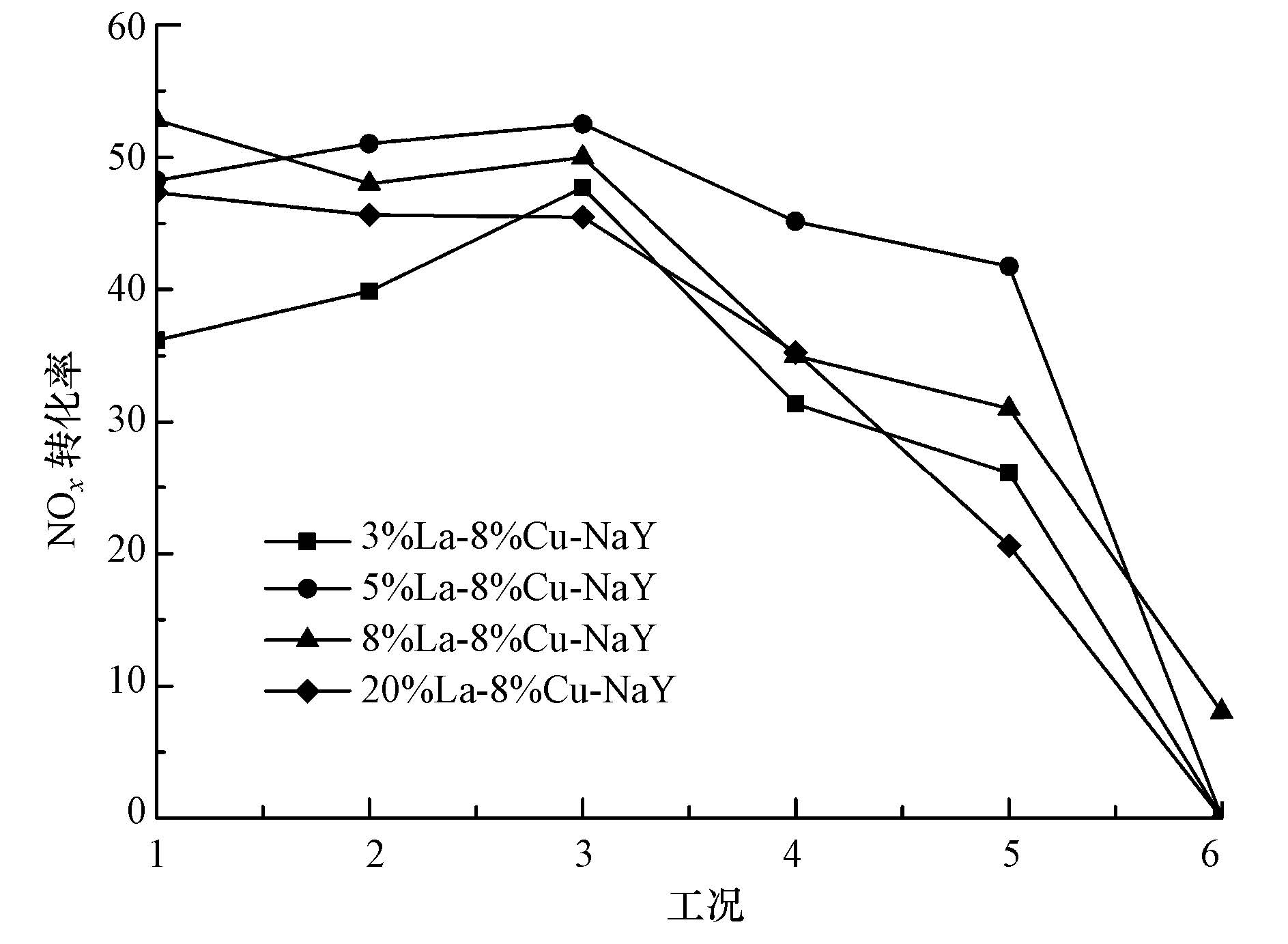 3)La的加入同样可以使催化剂活性上升,但并没有最佳的La交换量,不同La含量催化剂的NOx转化率相差较小.
