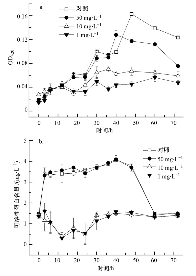 不同浓度石墨烯处理下培养体系可溶性蛋白含量如图 1b所示. 由图可知,对照组的蛋白质含量在培养3 h后达到3.360 mg · L-1,随着时间的增长体系内蛋白质含量呈现缓慢上升趋势,于48 h时达到最大值3.789 mg · L-1,48 h后呈现下降趋势. 由于经过48 h,培养基被消耗,不能为微生物的生长提供足够的养分,导致体系内微生物死亡,细胞破裂,蛋白质含量降低. 在石墨烯处理试验组,当石墨烯投加量为1 mg · L-1和10 mg · L-1时,体系中可溶性蛋白含量呈现先减少后增大的现象. 而高浓度(50 mg · L-1)石墨烯试验组的蛋白质含量变化趋势与对照组的趋势近乎一致. 可解释为高浓度石墨烯在菌液中易团聚,能够作为细菌生长的载体,并吸附细菌生长所需要的营养物质,为细菌的繁殖提供了营养丰富的附着基底(Chen et al.,2008;Ruiz et al.,2011). 本文实验结果发现,高浓度石墨烯处理的菌的生长状况比低浓度好,这可能是低浓度的石墨烯分散性相对好于高浓度的石墨烯,与游离菌接触更加充分,分散在菌液中的石墨烯通过氧化应激、凝聚作用及物理接触的方式的联合作用对细胞产生毒性(Zhang et al.,2010),而高浓度的石墨烯反而由于团聚作用形成菌的生长载体,毒性不明显. 细菌OD420和蛋白质均是表征生物量的重要指标(Long et al.,2014). 然而,两种指标呈现的结果存在共同点时也有不同之处. 由于可溶性蛋白还代表各种酶和代谢调节物,与生物对环境胁迫的响应有关,细胞在适应石墨烯胁迫的生理过程中调节酶的合成与降解以适应新的环境.