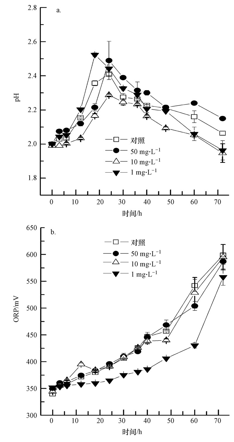 由图 2b可以看出,所有处理的ORP均呈不断上升趋势直至培养结束(72 h).石墨烯投加量为50和10 mg · L-1试验组的ORP均低于空白处理体系的ORP,但培养结束后3个体系的ORP都维持在600 mV左右. 当石墨烯的投加量为1 mg · L-1时,培养体系的ORP上升速度要明显低于其他处理. 说明高浓度的石墨烯对Acidithiobacillus ferrooxidans的氧化还原反应影响较小,而低浓度的石墨烯则抑制了它的活性. ORP上升主要由两种机制引起:第一种为生物反应主导的电子传递过程,是由于菌体在第一阶段的生长中能将Fe2+氧化为Fe3+失去电子使ORP迅速提高(Li et al.,2007),这一机制适用于对照组及50和10 mg · L-1试验组;第二种机制为化学反应主导的电子传递过程,是由于Fe2+通过利用空气中的分子氧进行化学氧化为Fe3+使ORP得到提高,这一机制适用所有处理. 因此,1 mg · L-1试验组的ORP上升较为缓慢.