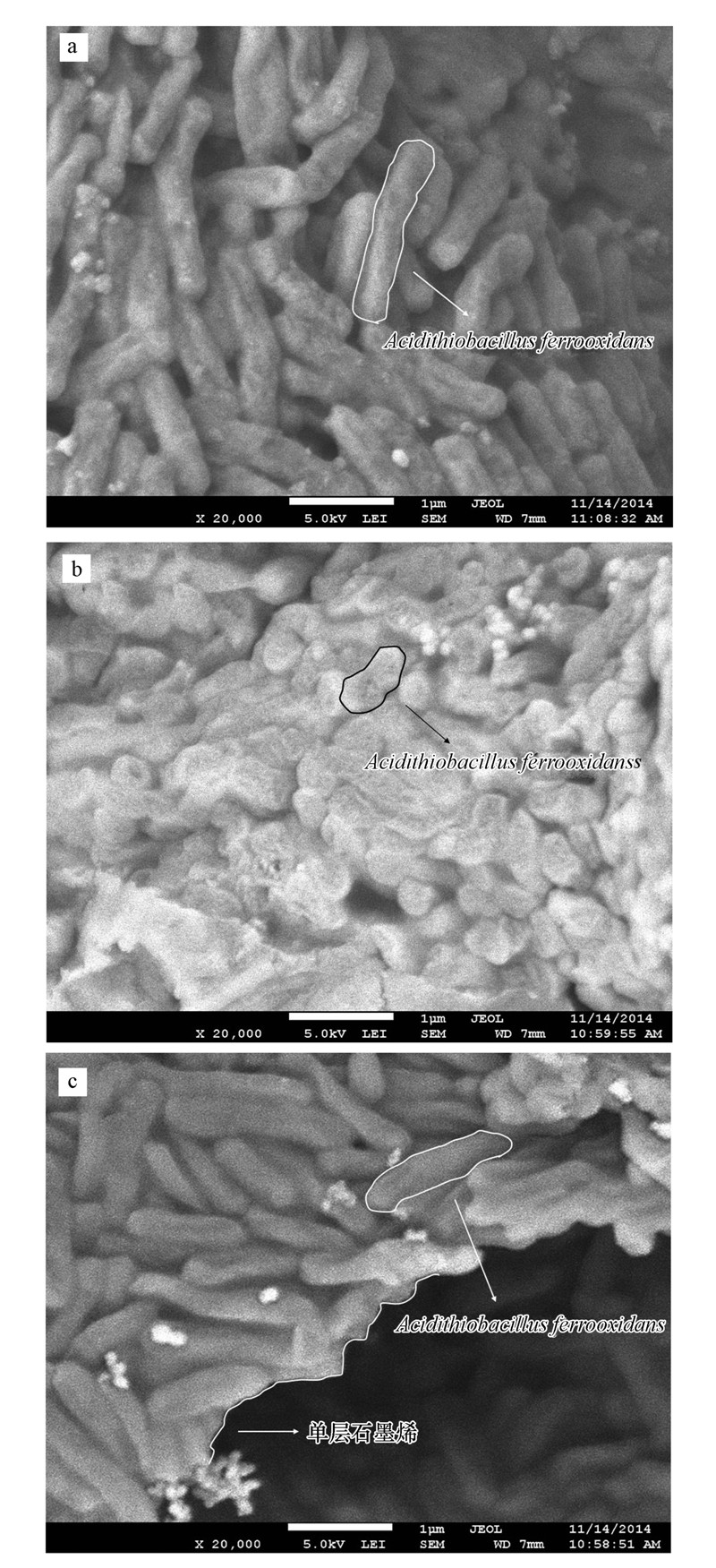 | 图 3 菌体接触石墨烯前后SEM图(×20 000)(a.游离菌;b. 游离菌+1 mg · L-1石墨烯;c. 游离菌+50 mg · L-1石墨烯) Fig. 3 The SEM of Acidithiobacillus ferrooxidans treated cells with different concentration of graphene(a.native cells; b.cells with 1 mg · L-1graphene; c.cells with 50 mg · L-1 graphene) |