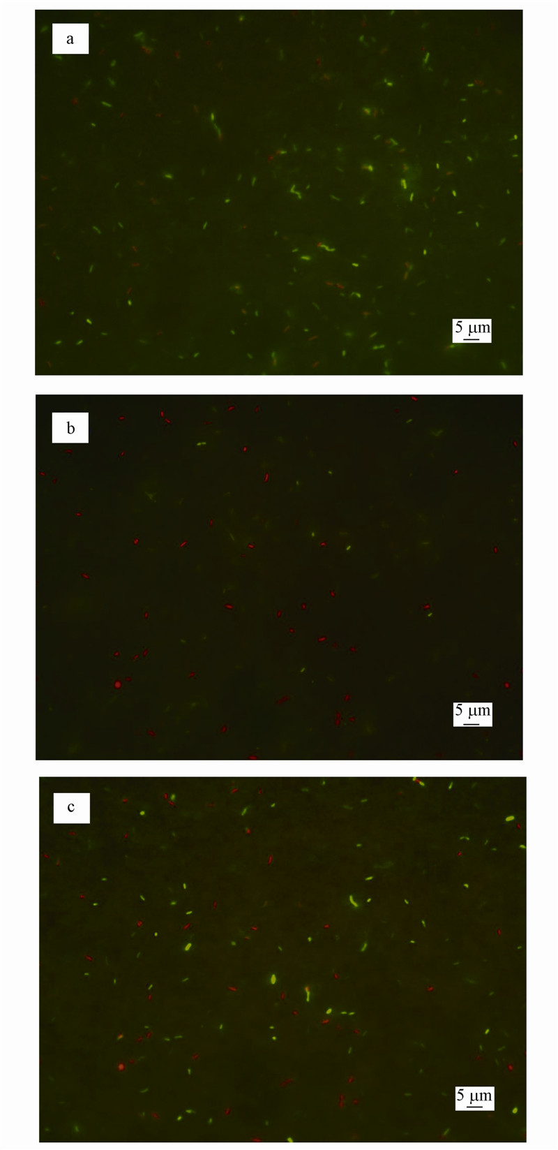 | 图 4 菌体接触石墨烯前后荧光显微镜图(1000×)(a.培养前;b.菌+1 mg · L-1石墨烯;c.菌+50 mg · L-1石墨烯) Fig. 4 The fluorescence microscope images of normal Acidithiobacillus. ferrooxidans and treated cells with different concentration of graphene(a.native Acidithiobacillus. ferrooxidans cells; b.cells with 1 mg · L-1 graphene; c.cells with 50 mg · L-1 graphene) |