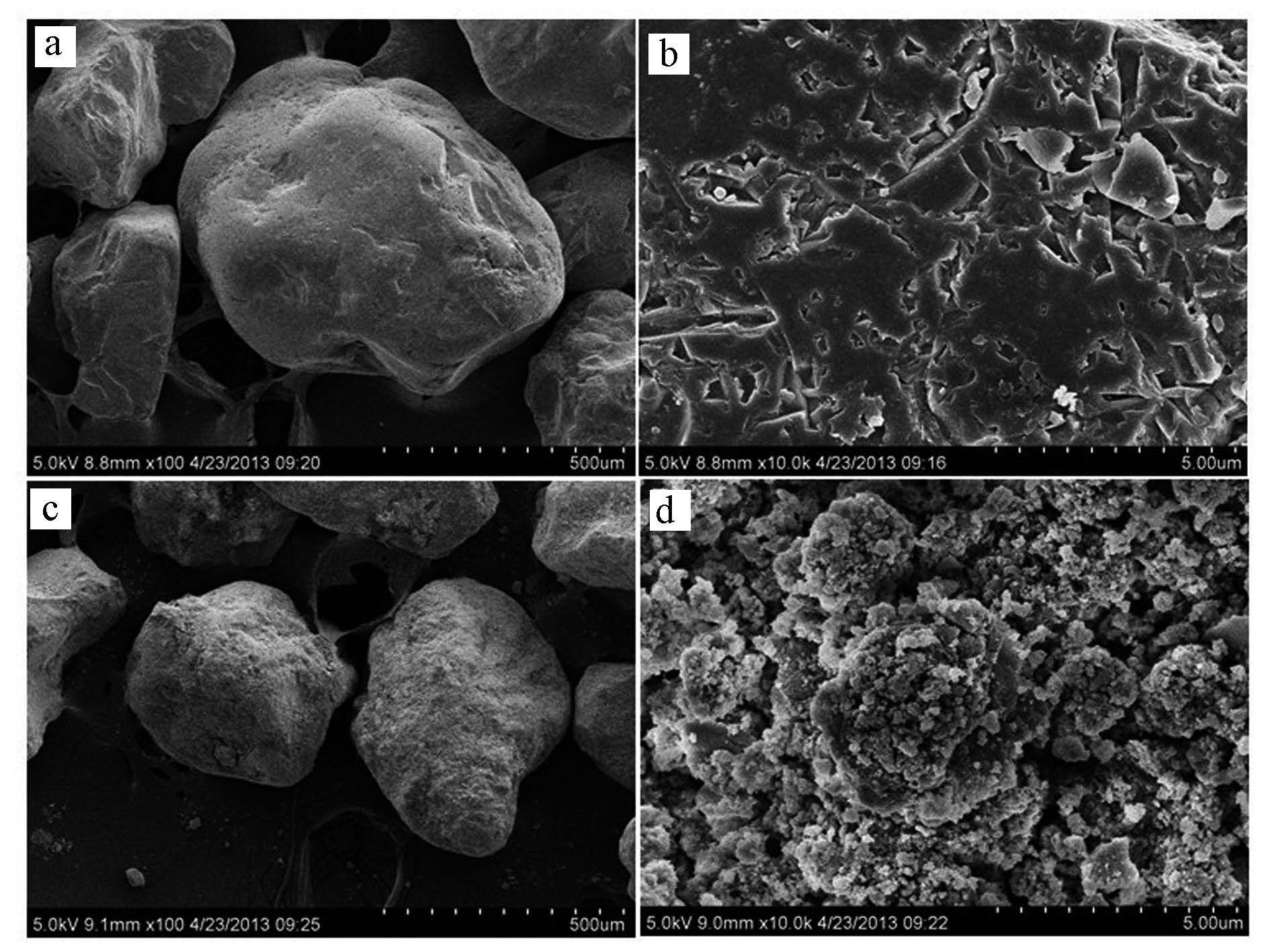 | 图1 海砂与包覆海砂的扫描电镜照片(a. 海砂×100倍; b. 海砂×10000倍; c. 包覆海砂×100倍; d. 包覆海砂×10000倍) Fig.1 SEM images of original s and and coated s and (a. OS×100; b. OS×10K; c. MS×100; d. MS×10K) |