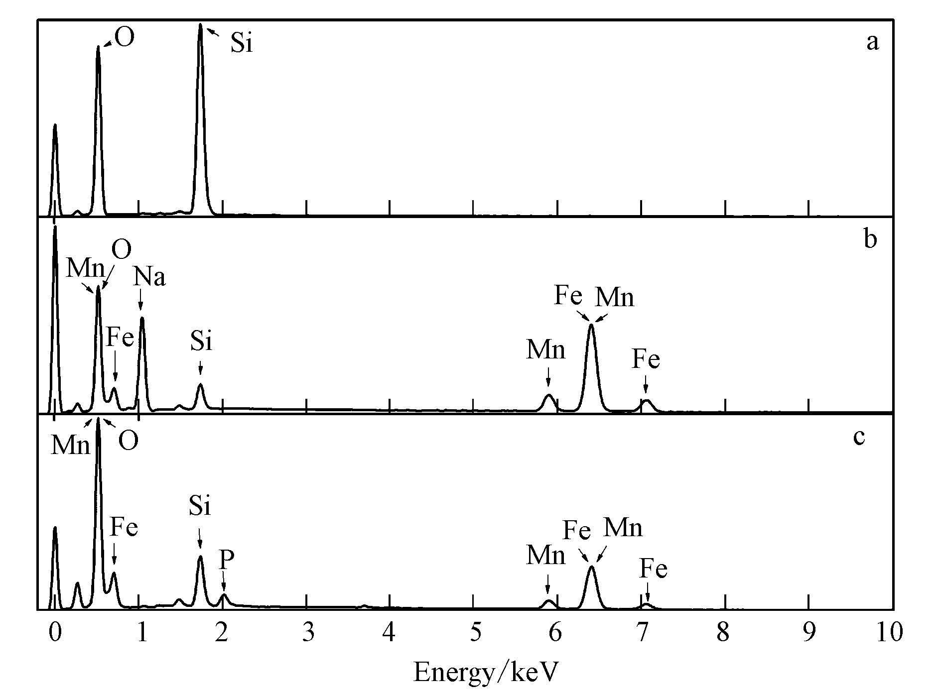 海砂与包覆海砂磷吸附前后的EDAX图谱如图 2所示. 海砂以硅元素与氧元素为主要成分,包覆铁锰复合氧化物后,出现了明显的铁元素与锰元素的特征峰,表明铁锰复合氧化物包覆在海砂的表面. 吸附磷后包覆海砂的EDAX图谱又出现了磷元素的特征峰,表明铁锰复合氧化物包覆海砂对溶液中的磷具有吸附性能.