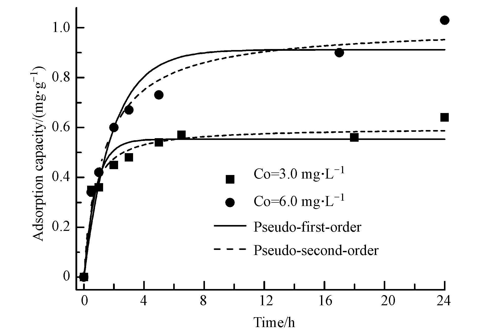 | 图4 包覆海砂对磷的吸附动力学(磷初始浓度分别为6.0 mg · L-1和3.0 mg · L-1,溶液体积=1.0 L,吸附剂投加量=4 g,pH=5.0±0.1,转速=200 r · min-1,T=(25±1)℃,平衡时间=24 h) Fig.4 Kinetics of phosphate adsorption on coated s and at initial P concentrations=6.0 mg · L-1 and 3.0 mg · L-1,volume of solution=1.0 L,adsorbent dose=4.0 g,pH=5.0 ± 0.1,agitation speed=200 r · min-1,T=(25±1)℃, and equilibrium time=24 h |