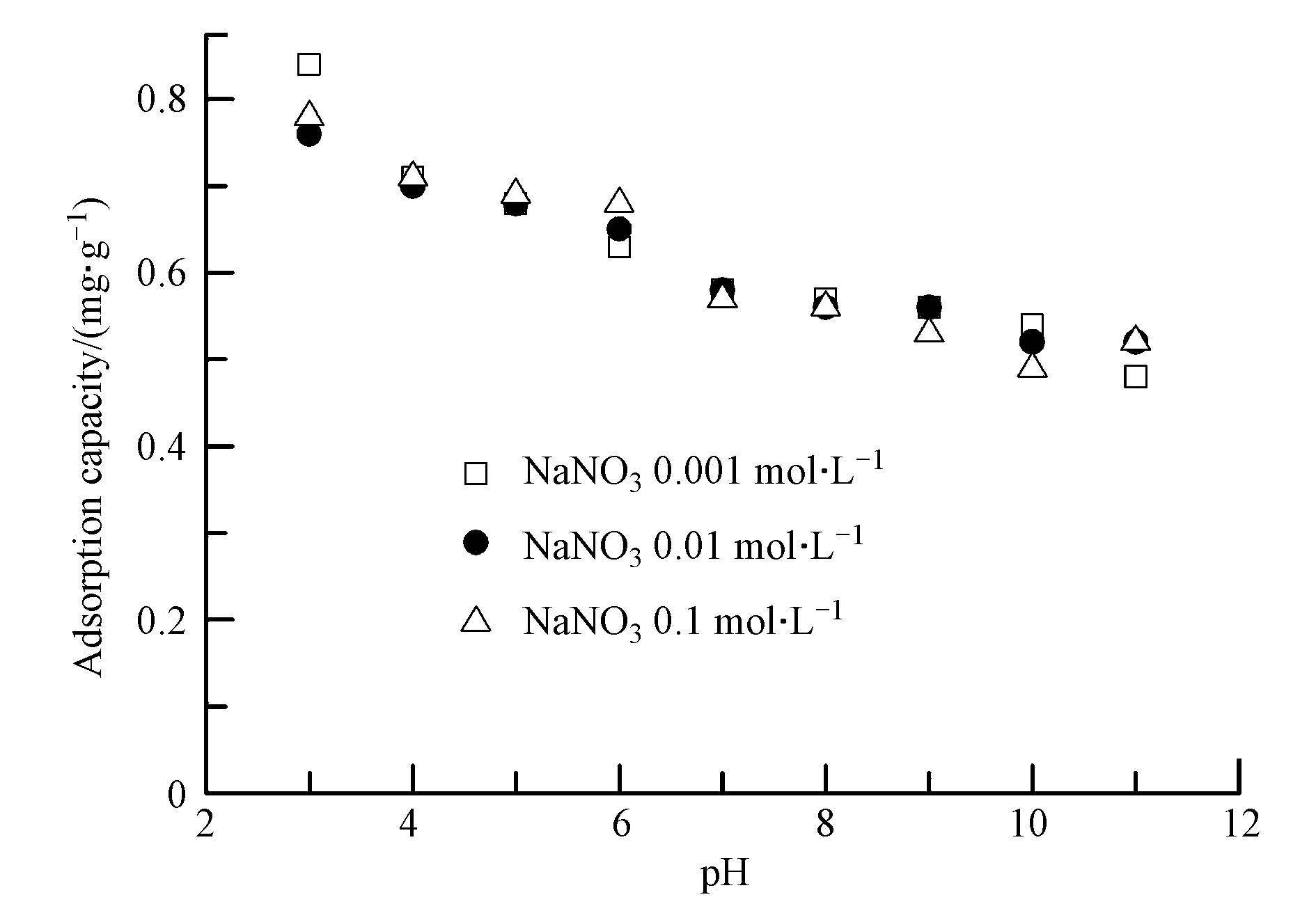 2.4.3 pH与离子强度影响配制一系列50 mL浓度为5.0 mg · L-1磷溶液,分别投加200 mg吸附剂,考察不同pH(3.0~11.0)和不同离子强度(0.1 mol · L-1,0.01 mol · L-1,0.001 mol · L-1 NaNO3)对吸附磷的影响. 用HNO3和NaOH调节溶液pH,使pH稳定在不同预定值.