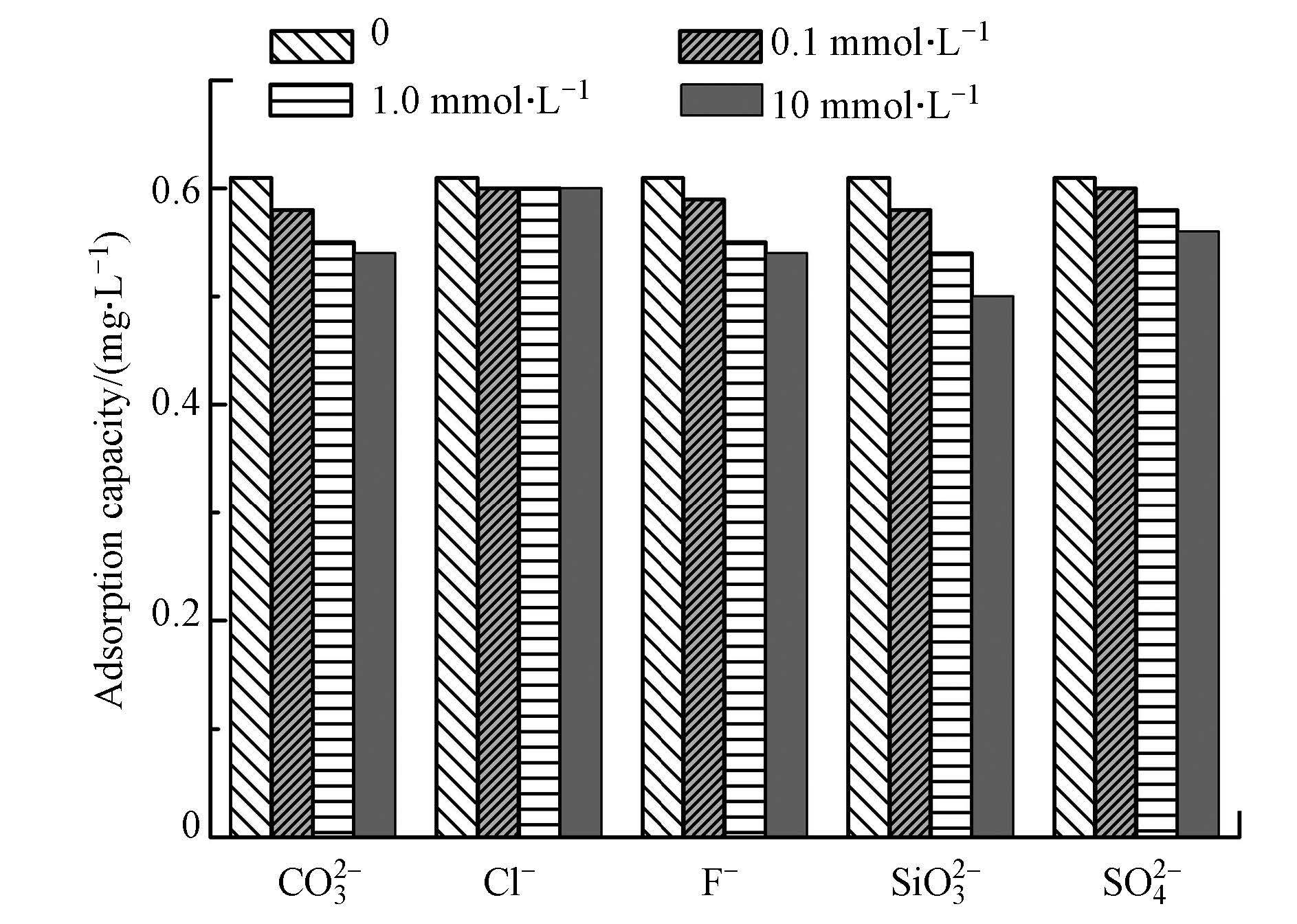 2.4.4 共存离子影响配制一系列50 mL浓度为5.0 mg · L-1磷溶液,溶液pH 7.0±0.1,分别投加200 mg吸附剂,考察Cl-、F-、CO32-、SO42-与SiO32- 5种阴离子在4种不同浓度(0 mmol · L-1,0.1 mmol · L-1,1.0 mmol · L-1,10 mmol · L-1)时对吸附磷的影响.