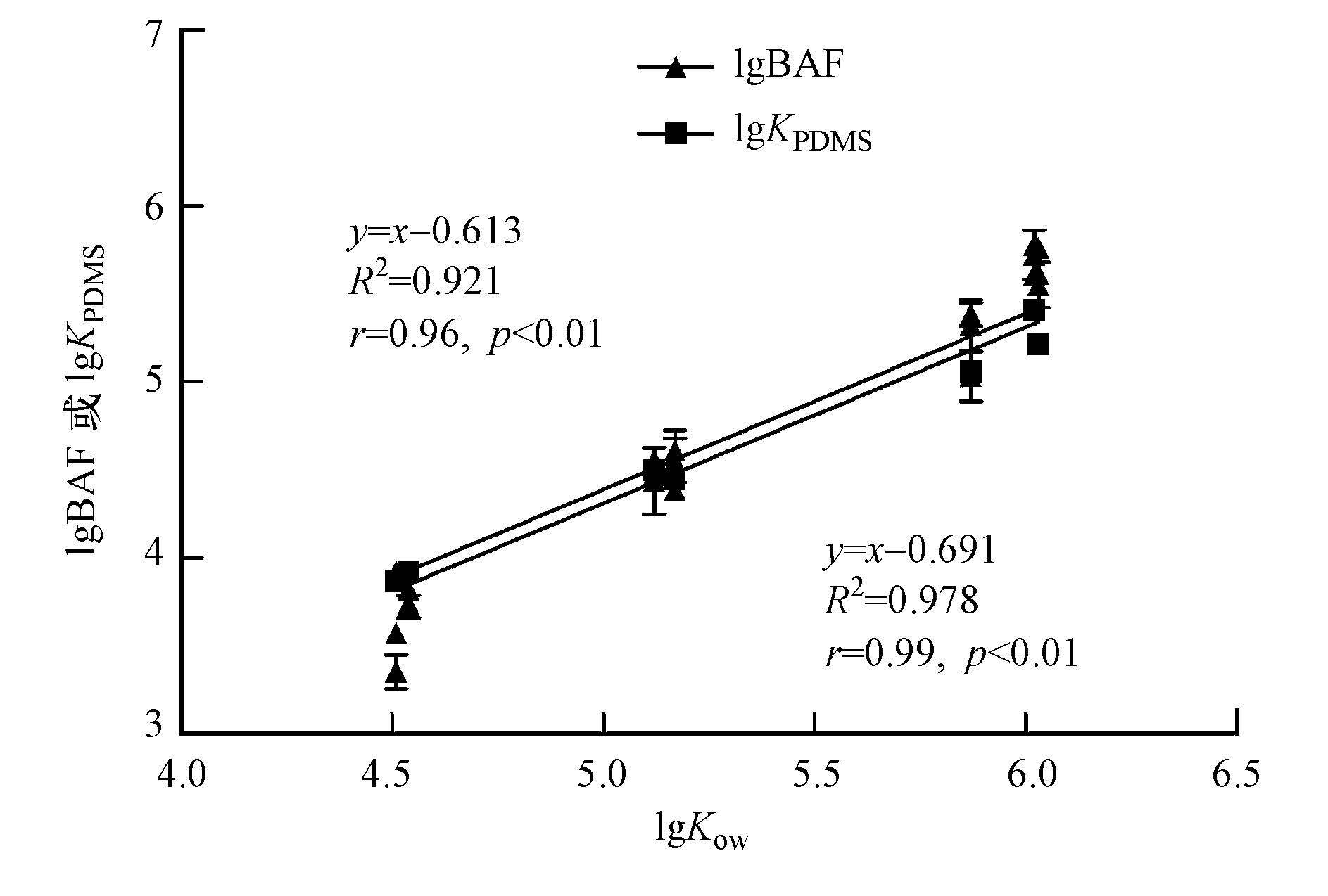 | 图1 lgKow与lgBAF和lgKPDMS的关系 Fig.1 Correlations between octanol-water partition coefficient(Kow) and bioconcentration factors(BAFs)or PDMS-water partition coefficient(KPDMS) |