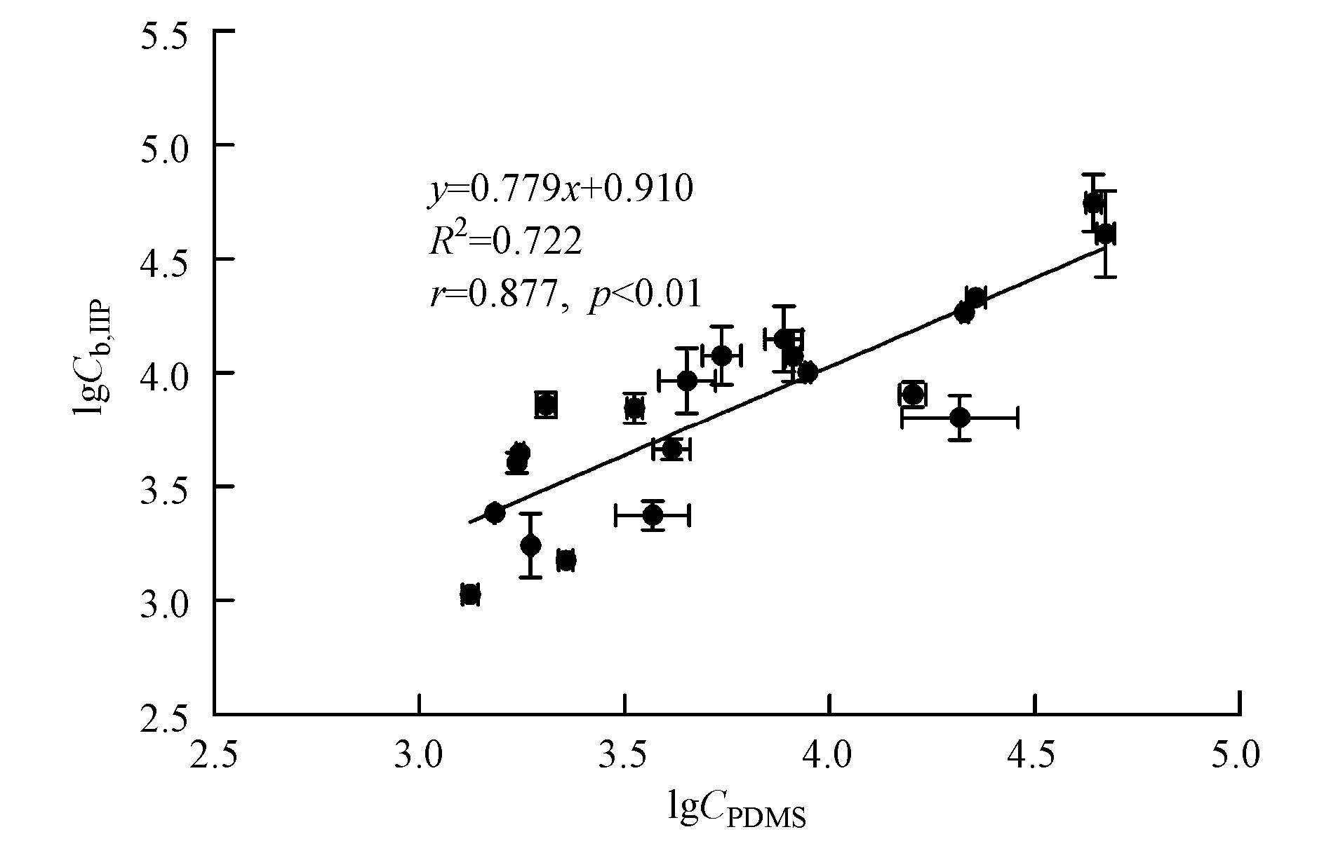 | 图2 lgCPDMS与lgCb,lip的关系 Fig.2 Correlation between concentrations of PAHs in Ruditapes philippinarum and in polydimethylsiloxane(PDMS) |