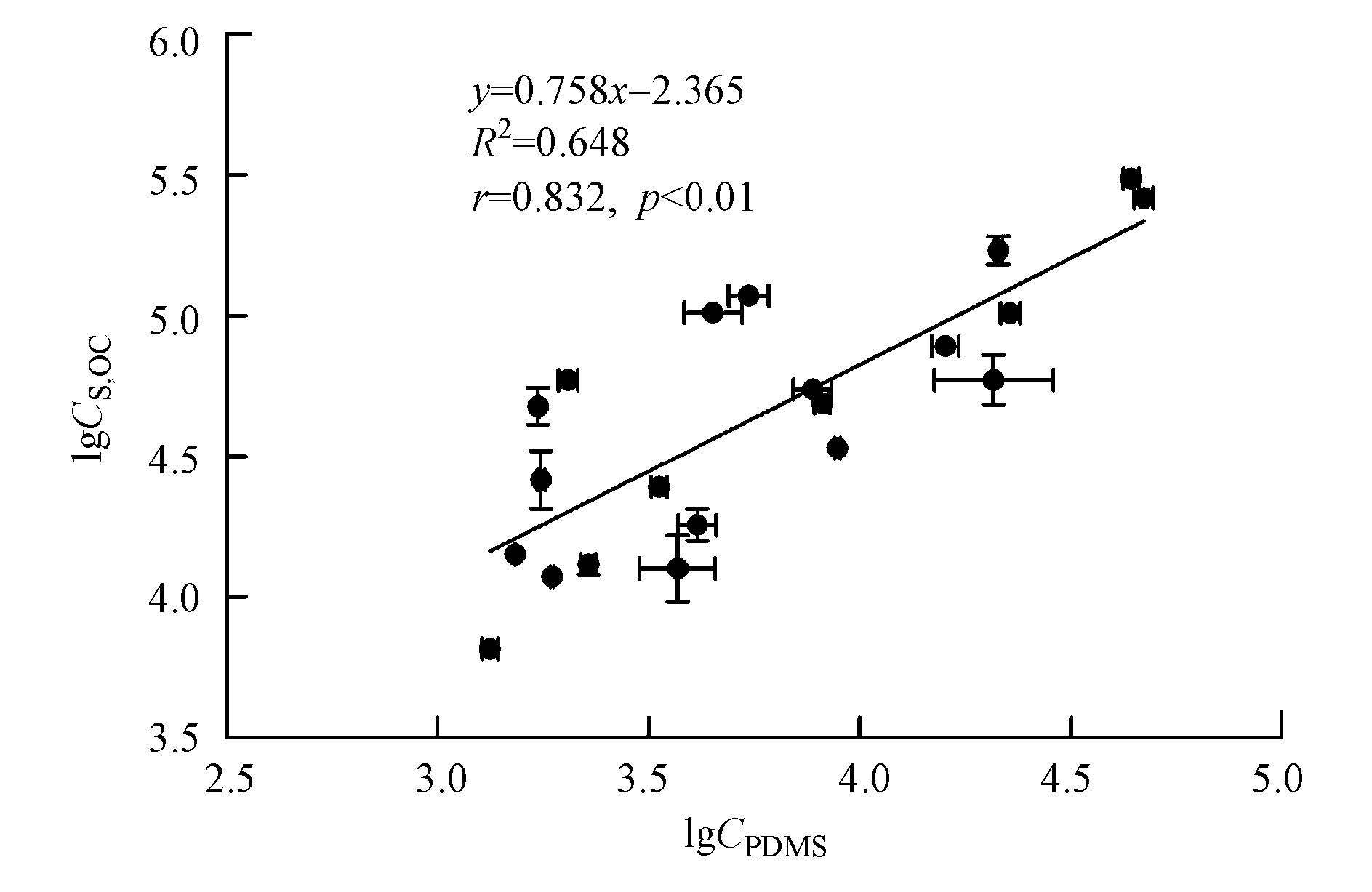| 图3 lgCPDMS与lgCS,OC的关系 Fig.3 Correlation between concentrations of PAHs in sediment and in polydimethylsiloxane(PDMS) |