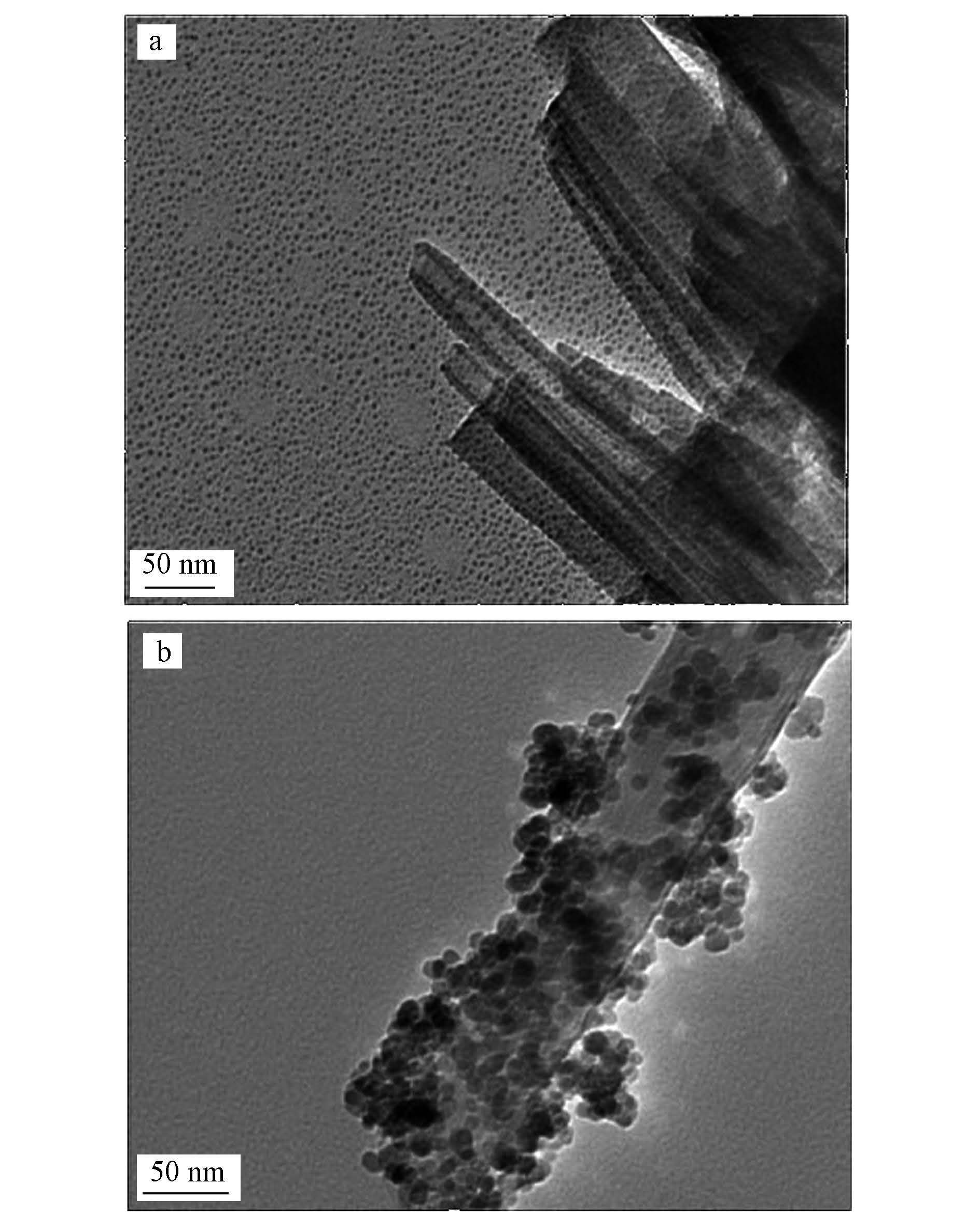分析 图 1是 HNTs和MHNTs 在透射电子显微镜下的扫描图,从图 1a中可以看出,HNTs为形态完整的管状结构,尺寸分布均匀稳定.在图 1b中可以很明显的观察到Fe3O4 纳米粒子成功负载在埃洛石表面.
