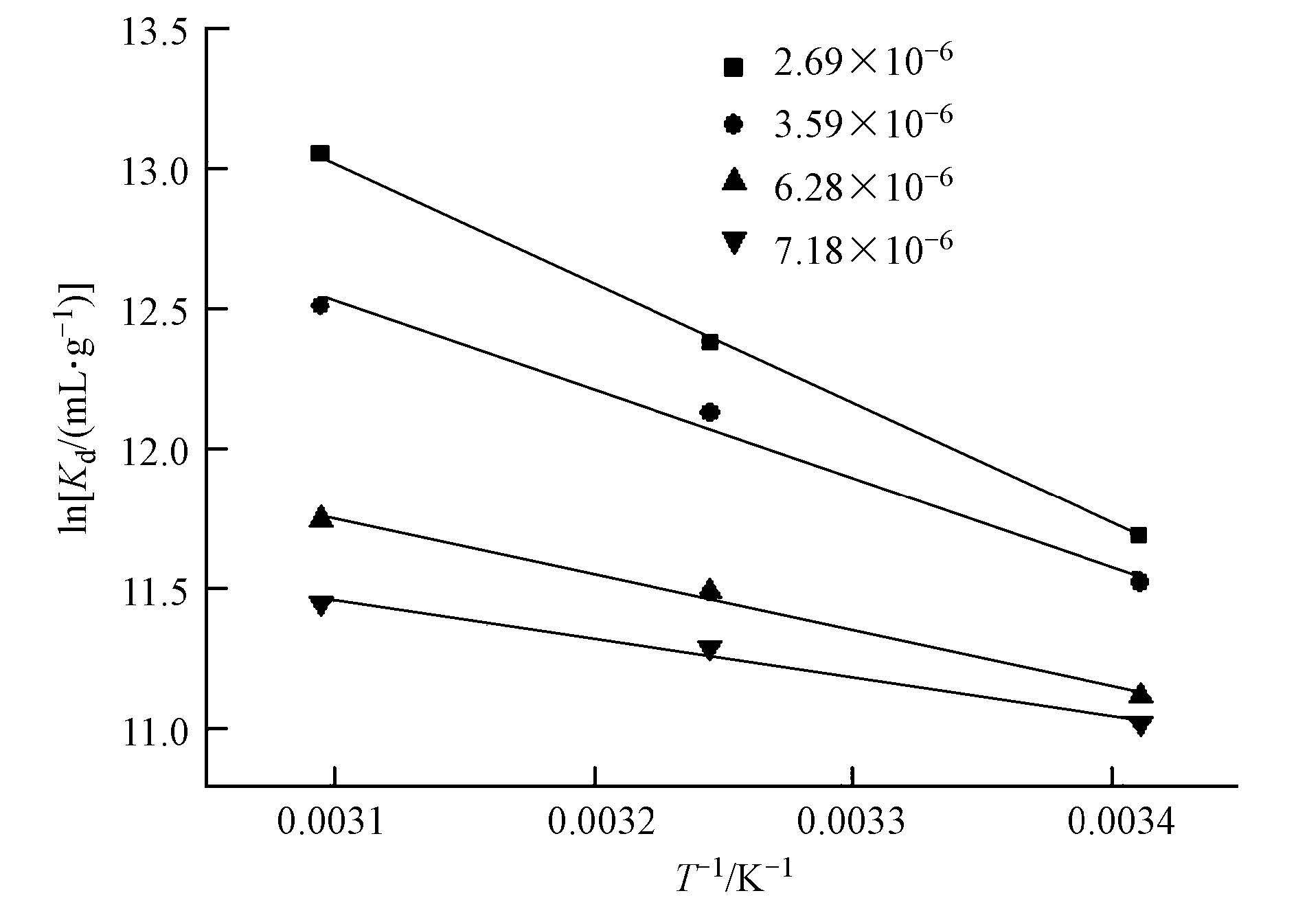 | 图10 十八烷胺在磁性埃洛石上吸附的热力学参数(实验条件:pH=3.5 ± 0.1,m/V=0.029 g · L-1,I=0.01 mol · L-1 NaCl) Fig.10 Linear plots of lnKd versus 1/T |