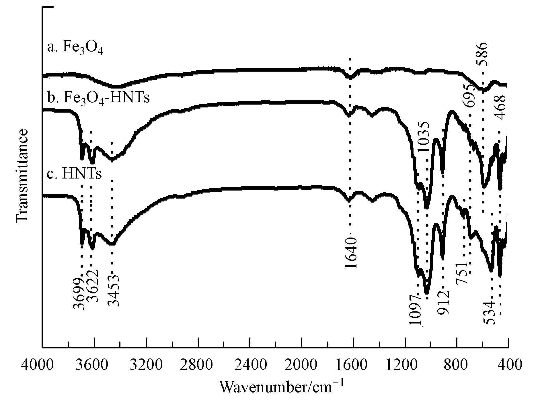 | 图2 Fe3O4、HNTs和MHNTs的红外光谱图 Fig.2 FTIR spectra of Fe3O4,halloysite(a) and magnetic halloysite(b) |