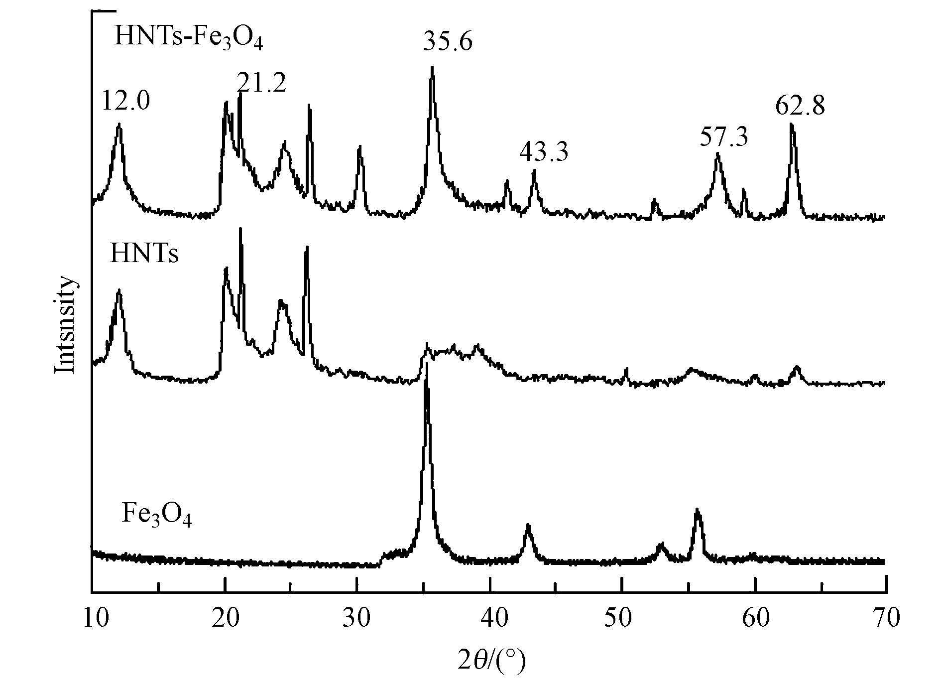 | 图3 HNTs、Fe3O4和MHNTs的XRD图谱 Fig.3 X-ray diffraction patterns of halloysite,Fe3O4 and magnetic halloysite |