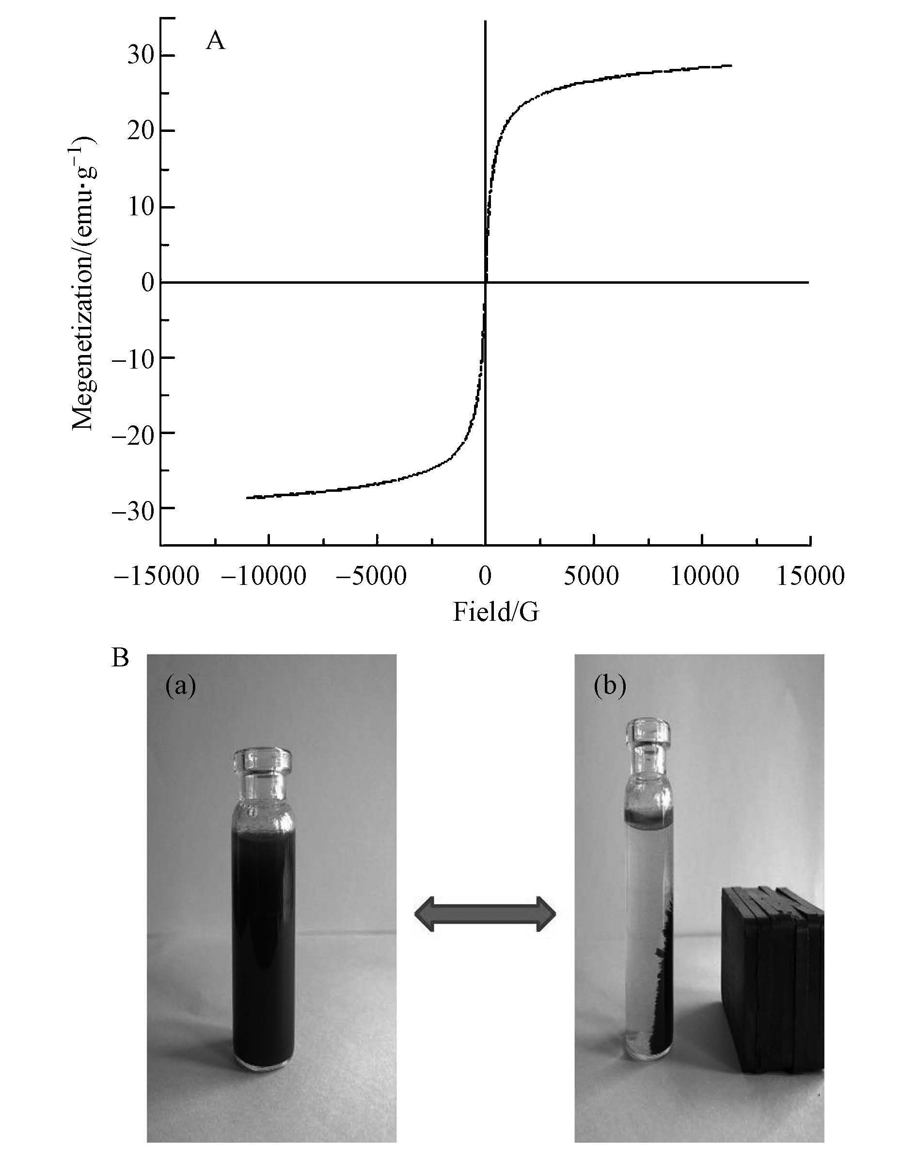 | 图4 (A)MHNTs的磁滞回线,(B)外磁场作用图 Fig.4 (A)VSM curve of magnetic halloysite,(B)effect of an externally magnetic field |