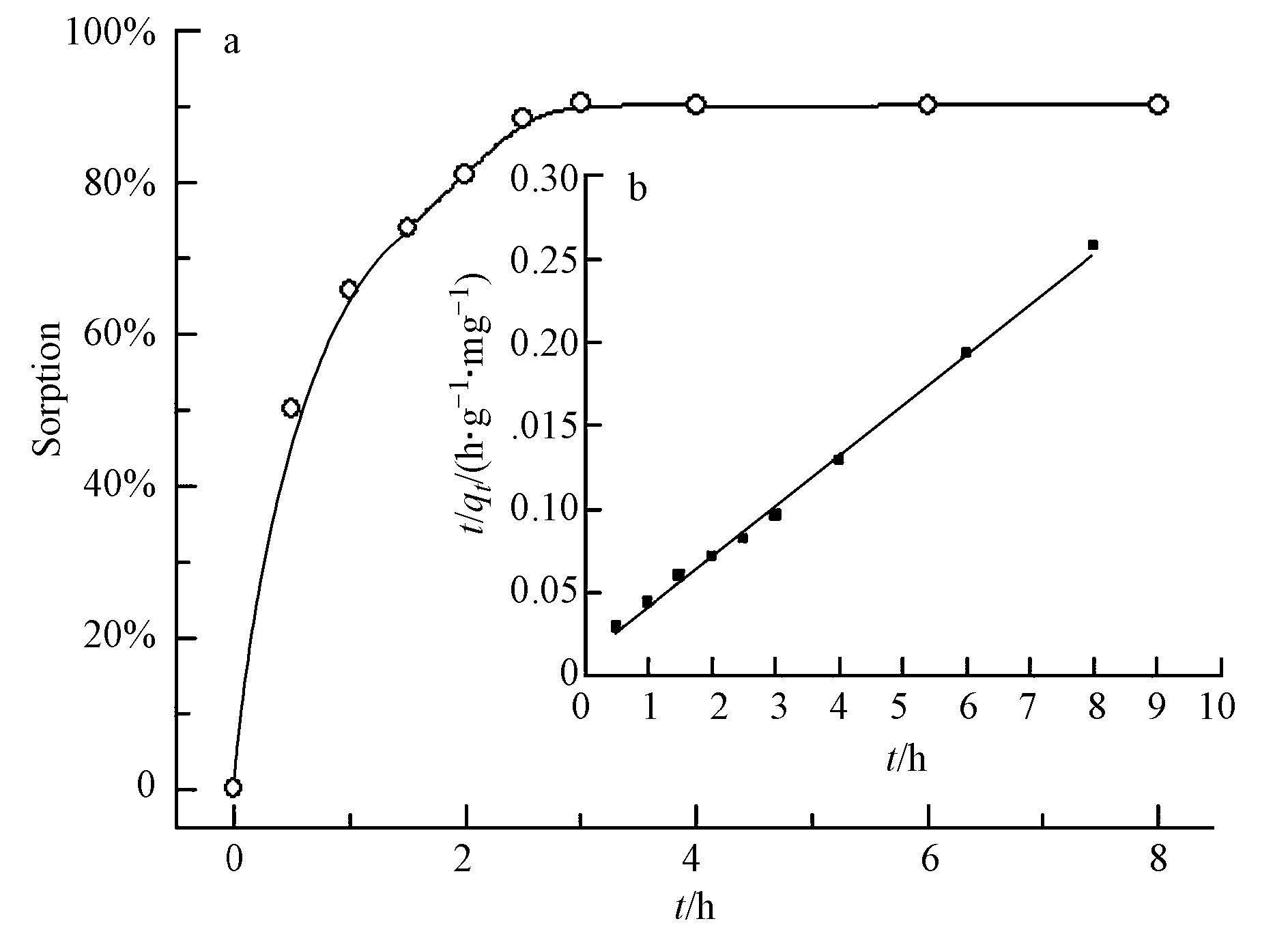 | 图6 吸附时间对十八烷胺吸附的影响(a)和磁性埃洛石吸附十八烷胺的准二级动力学程(b)(实验条件:T=293.15 K,pH=3.5 ± 0.1,C(octadecylamine)initial=1 mg · L-1,m/V=0.029 g · L-1,I=0.01 mol · L-1 NaCl) Fig.6 Effect of contact time on the adsorption of octadecylamine on magnetic halloysite(The inset figure is the pseudo-second-order rate equation fit of octadecylamine kinetic adsorption on magnetic halloysite) |