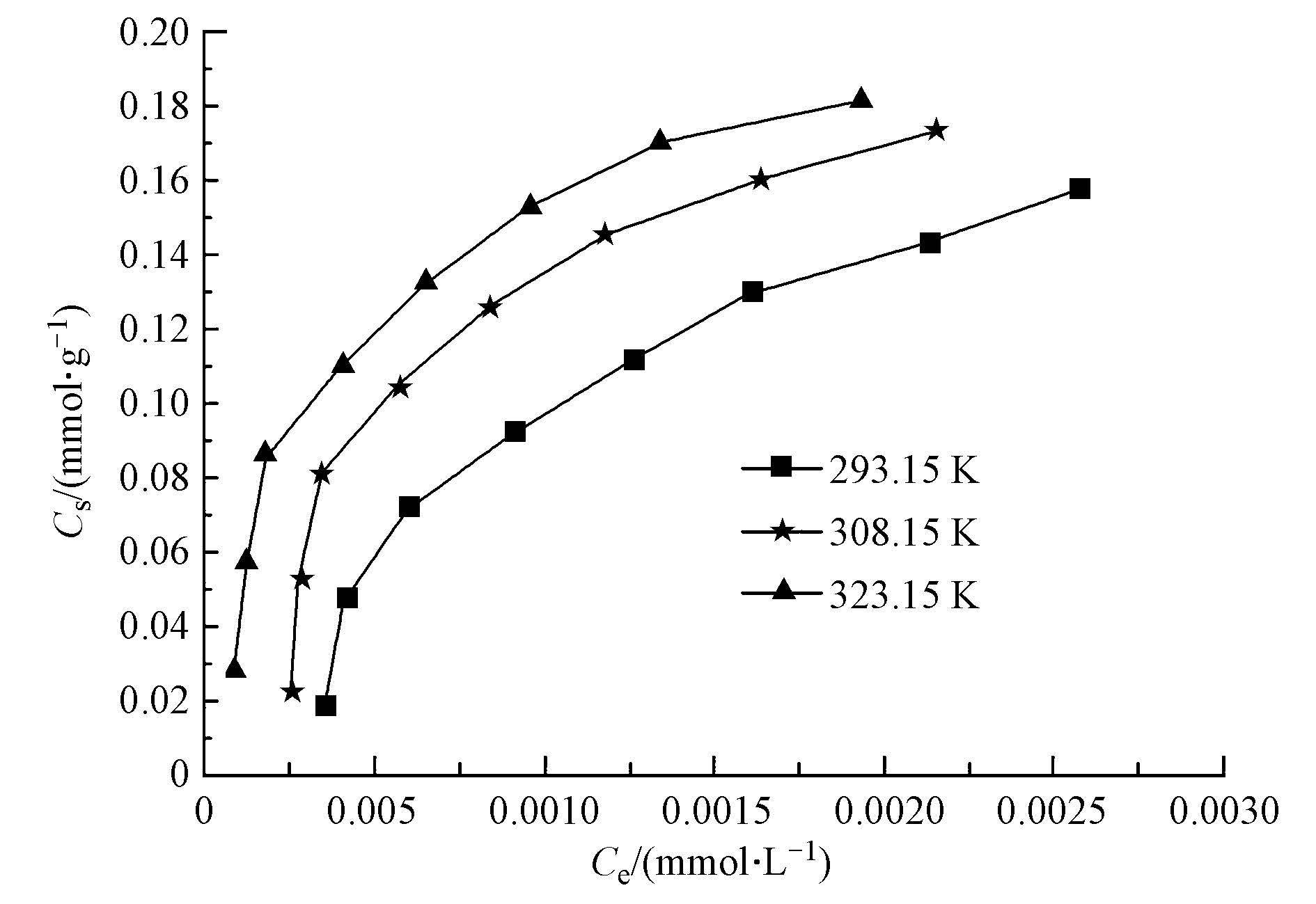 温度对十八烷胺吸附的影响及吸附热力学 研究不同温度对十八烷胺吸附效果的影响,控制pH=3.5,反应时间为8 h,吸附剂初始浓度为0.5 mg · L-1时取一定体积的十八烷胺溶液,并测定其浓度,考察不同温度对十八烷胺的吸附效果影响,结果如图 8 所示.通过在不同温度(T=293.15 K,308.15 K,323.15 K)下对十八烷胺在磁性埃洛石上的吸附进行了研究.由图 8可以看出,在十八烷胺浓度较低的情况下,温度对十八烷胺的吸附效果影响较小.此时,影响吸附效果的主要因素是十八烷胺的初始浓度.但是,整体趋势是随着温度的升高,十八烷胺的吸附量逐渐增大,即升高温度有利于磁性埃洛石对十八烷胺的吸附.
